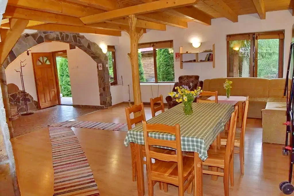 konyha, kis nappali kihúzható sarokheverővel, Tv-vel, valamint hálófülke és fürdő kapott helyet, fűtés csempekályhával. A házhoz tartozó telken, melyet egy patak választ el, grillsütő, bográcstűzhely és hintaágy található, valamint egy labdajátékoknak kialakított pálya, mely íjászatra és céllövészetre (légpuska) is kitűnően alkalmas.