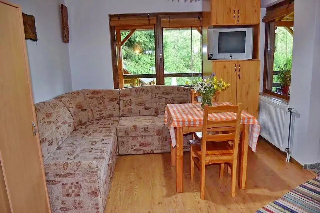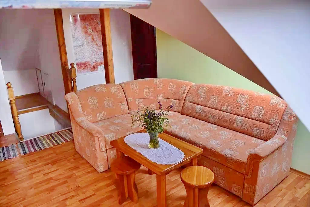 A nappaliban kihúzhatós sarokheverő, fotel, TV, internet, asztalitenisz.