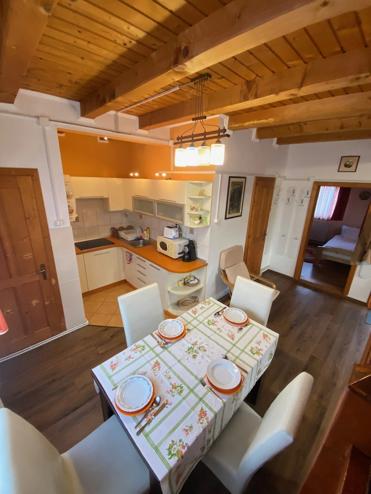 1 nagy társalgó kábel TV-vel és kandalóval, jobbra étkező felszerelt konyhával és kamrával.
