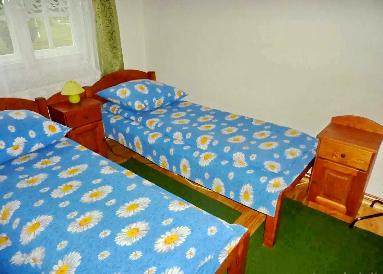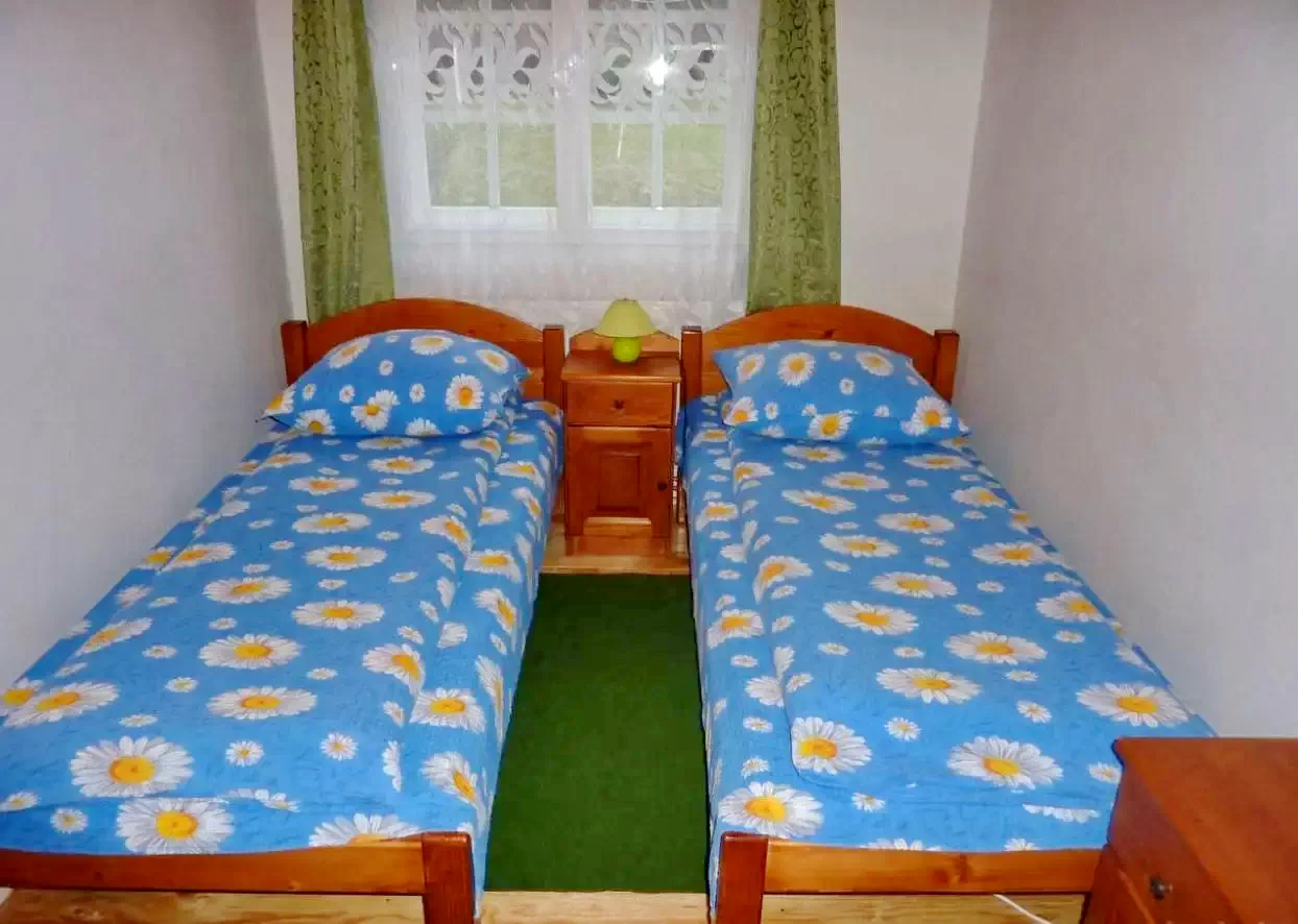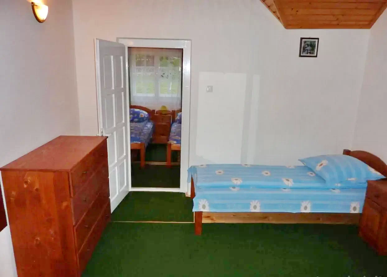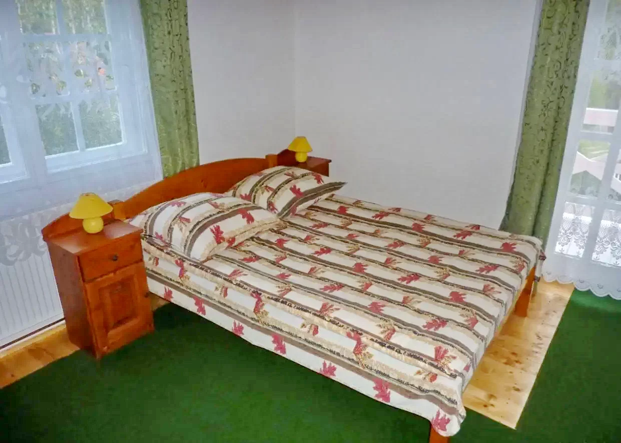 Az alsó szinten foglal helyet a nappali-ebédlő, konyha és fürdőszoba. (WC + zuhanyzókád + kézmosókagyló) Ezen a szinten lehetőség van egy kihúzhatós ágyat igényelni 2 fő részére. Az emeleten három szoba és egy fürdőszoba található. (WC + kézmosókagyló) Az elsőben egy egyszemélyes ágy és egy kétszemélyes ágy található. A második szobában két egyszemélyes ágy van. Ebből a szobából nyílik a harmadik szoba, melyben egy egyszemélyes és egy kétszemélyes ágy található. (Összesen 8 +(2) fő!)