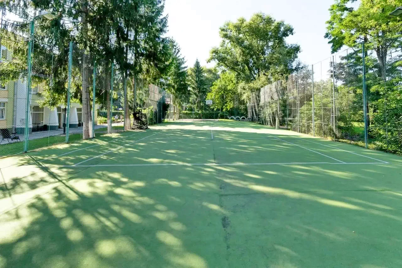A két épület közt talalható egy műgyepes, kivilágítható teniszpáya, mig oldalt egy 40 ferohelyes parkoló foglal helyet.