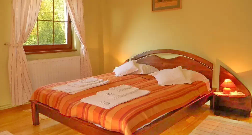- Minden szoba franciaággyal, az emeleti két szoba pedig egyszemélyes ággyal rendelkezik a franciaágy mellett.