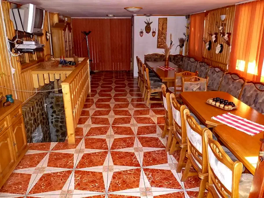 A földszinten felszerelt konyha és tágas ebédlő (kb. 30 személynek) áll rendelkezésre: bútorok, aragáz (tűzhely), hűtő, mikrohullámú sütő, teríték, evőeszközök, edények, debaré, stb.