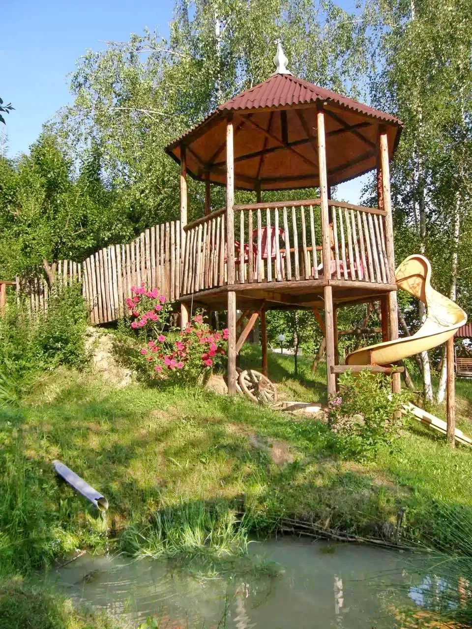 - A parkosított kertben játszótér, pihenőhinták és faragott erdei állatfigurák várják a vendégeket.