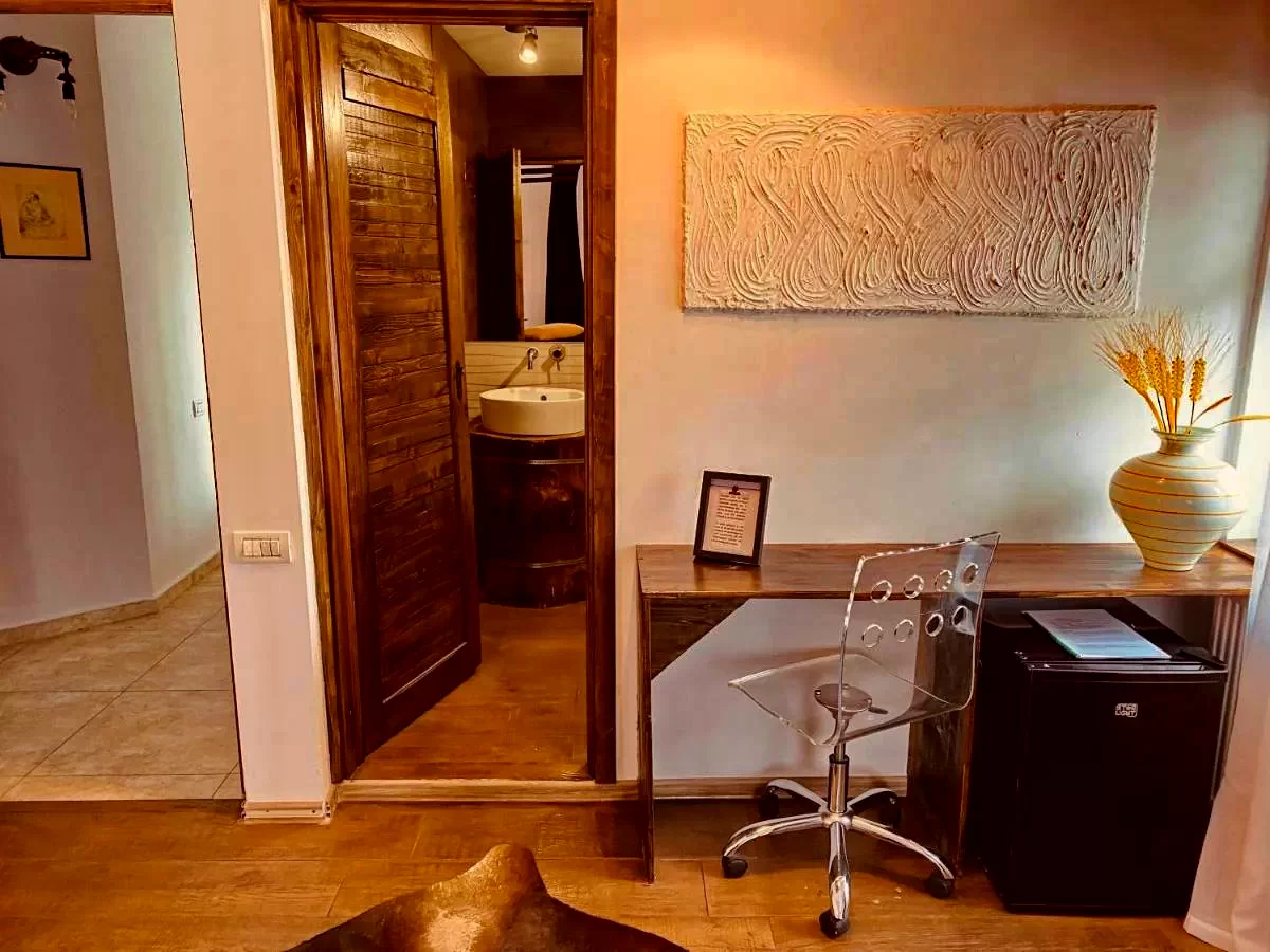 - 4. szoba: családi loft-szoba a villa emeletén, két szintes helyiségekből áll; az alsó szinten egy 140/200 cm-es ágy, a felső szinten szintén egy 140/200 cm-es ágy található; a felső szintre fix lépcsőn lehet feljutni. A fürdőszobában walk-in zuhany van.