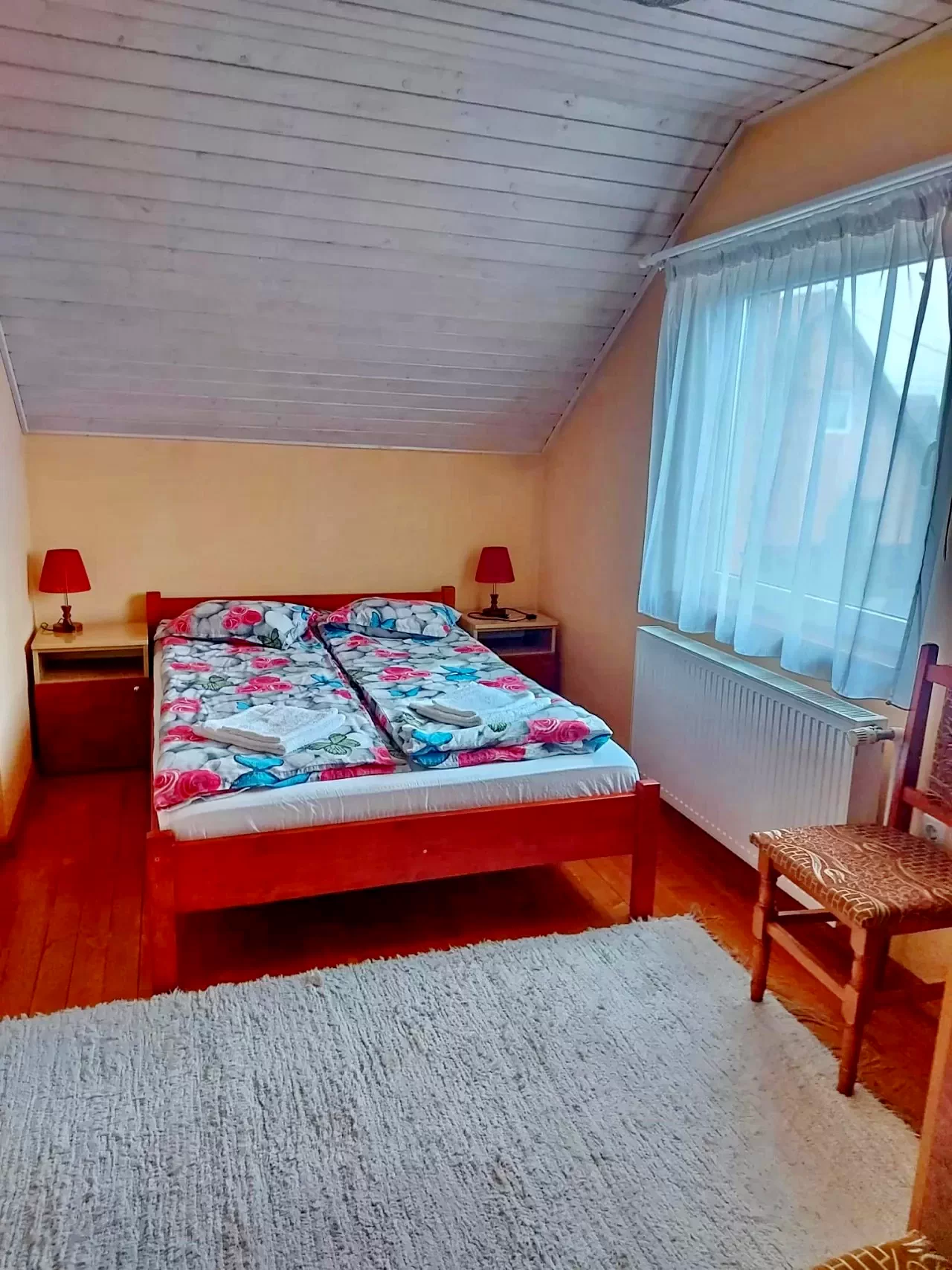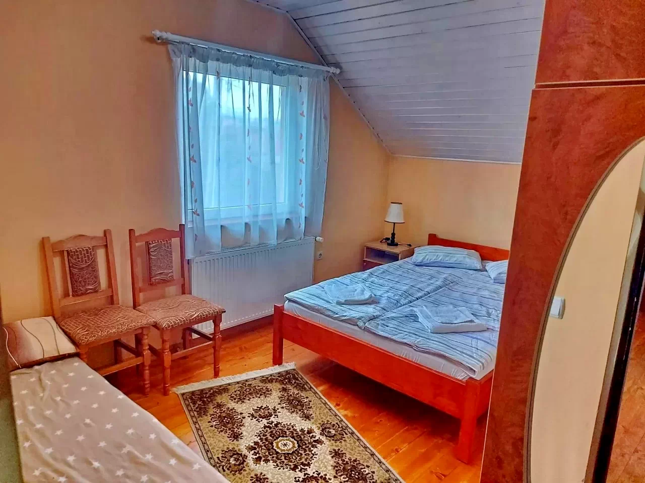 - Négyszemélyes szoba (1 franciaágy és 2 egyszemélyes ágy)