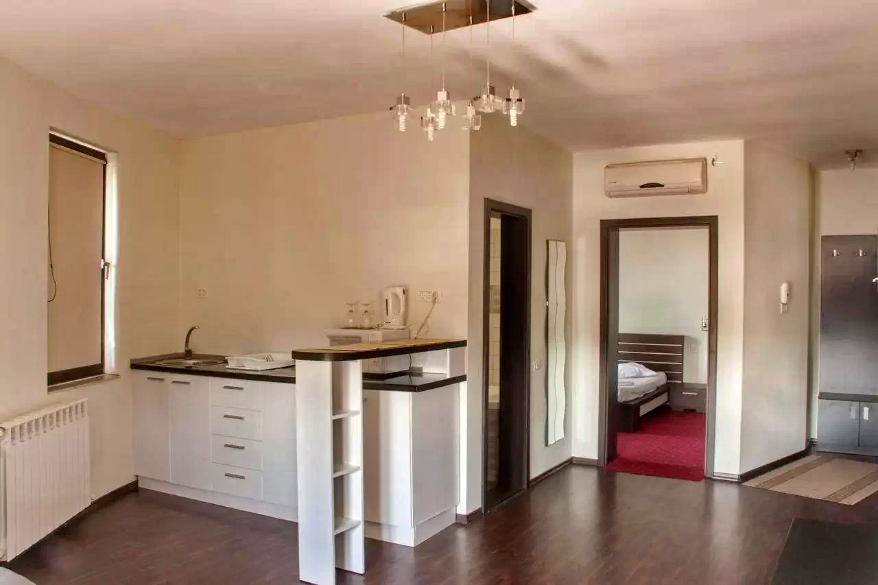* Az apartman egy 140/200-as kanapéval ellátott nappalival és egy 180/200-as kétszemélyes ággyal ellátott hálószobával rendelkezik. Felülete 45 nm.