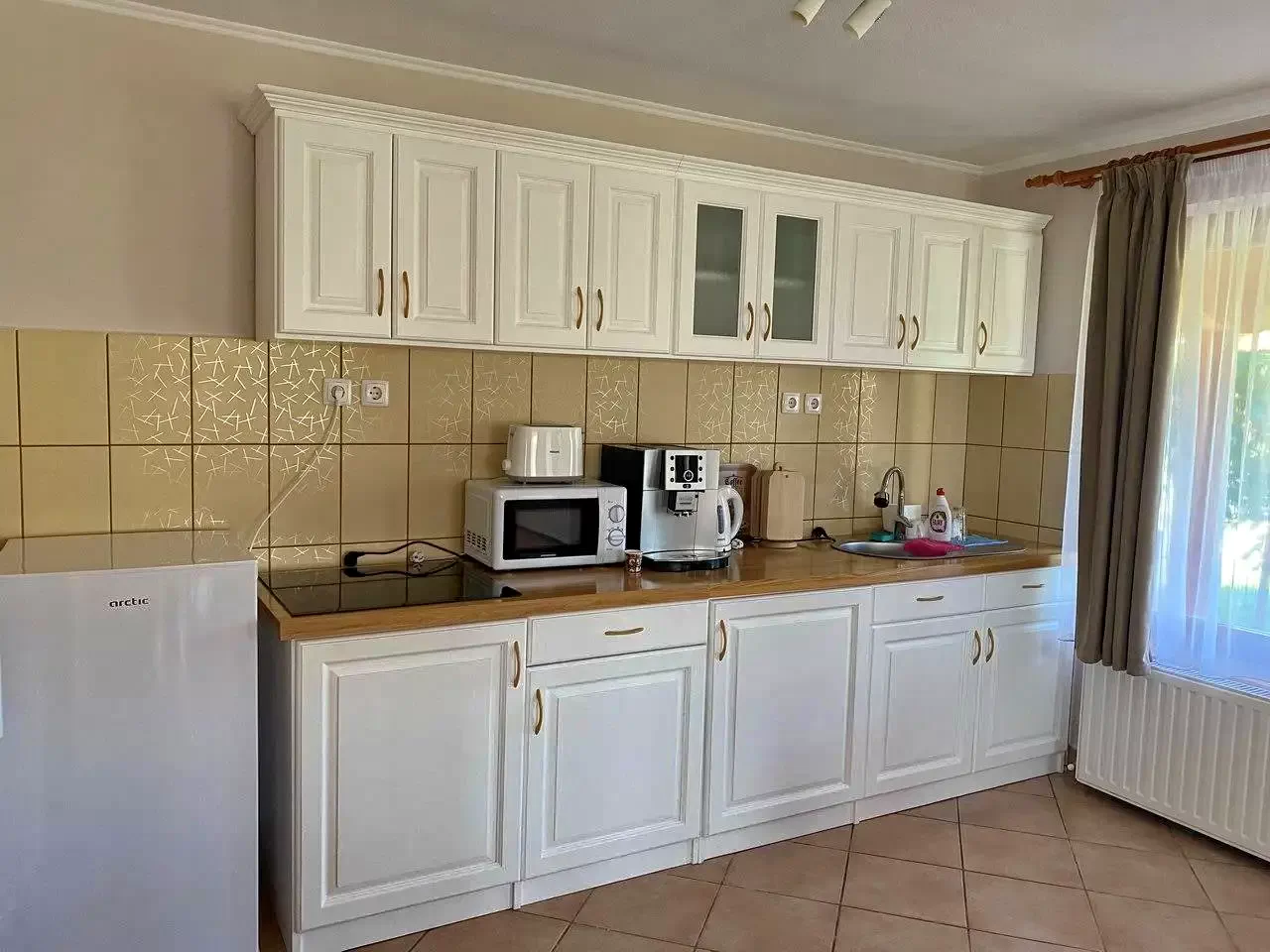 Teljesen felszerelt modern vendégkonyhával, valamint tágas, világos és elegánsan bútorozott szép nappalival rendelkezik.