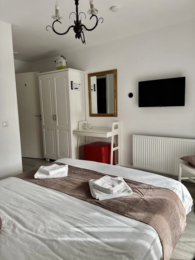 - 1 háromszemélyes szoba: 22 m²-es, erkéllyel, kertre néző kilátással, egy franciaágy és egy egyszemélyes ágy kombinációjával.