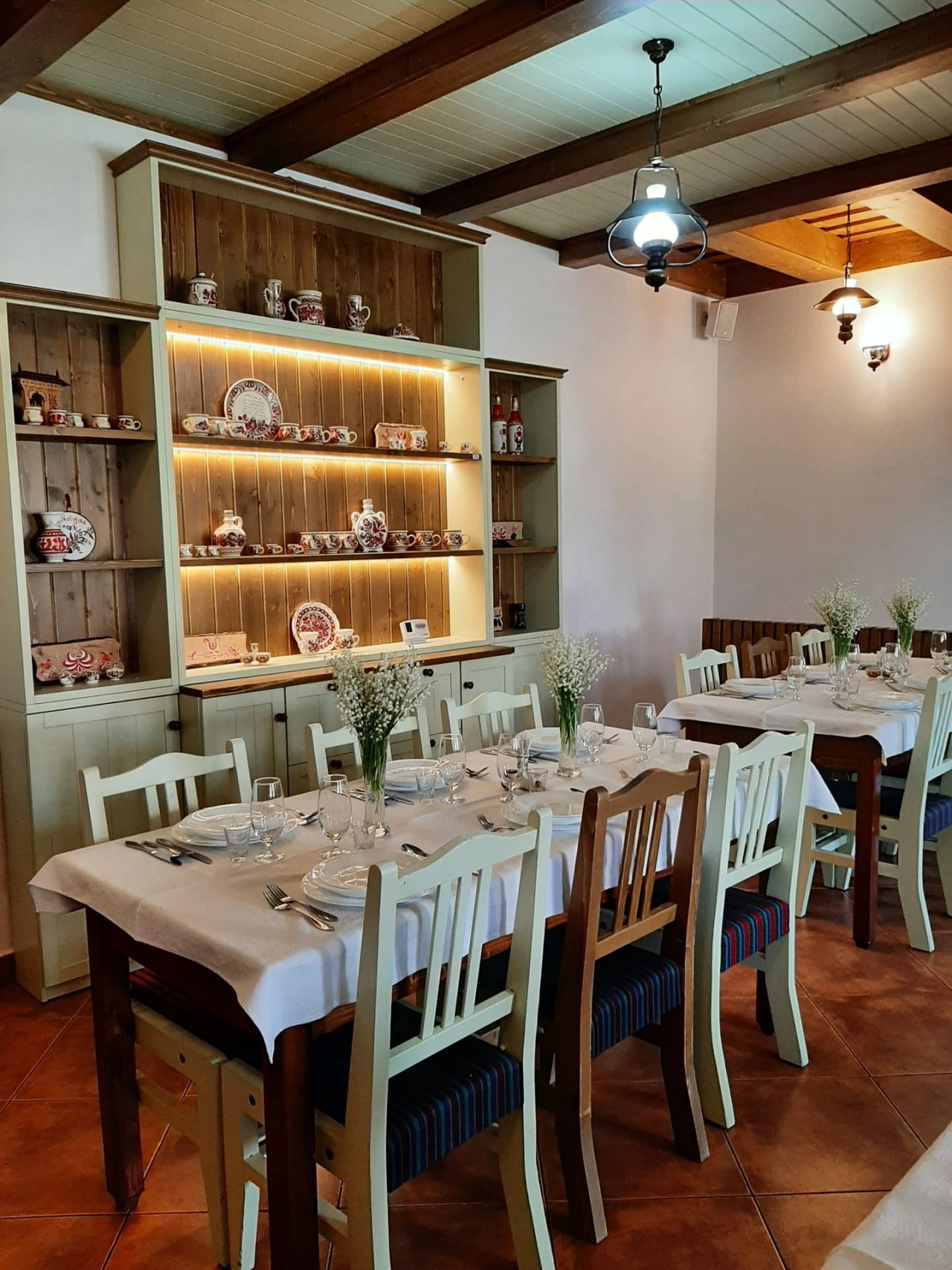 - Az épület földszintjén található egy tágas, 40 férőhelyes étterem, amely hagyományos székely stílusban, fa- és varrottas dekorációkkal van berendezve.