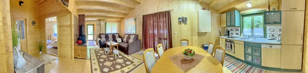 - A kulcsosház tágas, hangulatos kandallóval és tv-vel felszerelt nappalija, födött panorámás terasza számos beltéri program kiváló helye.