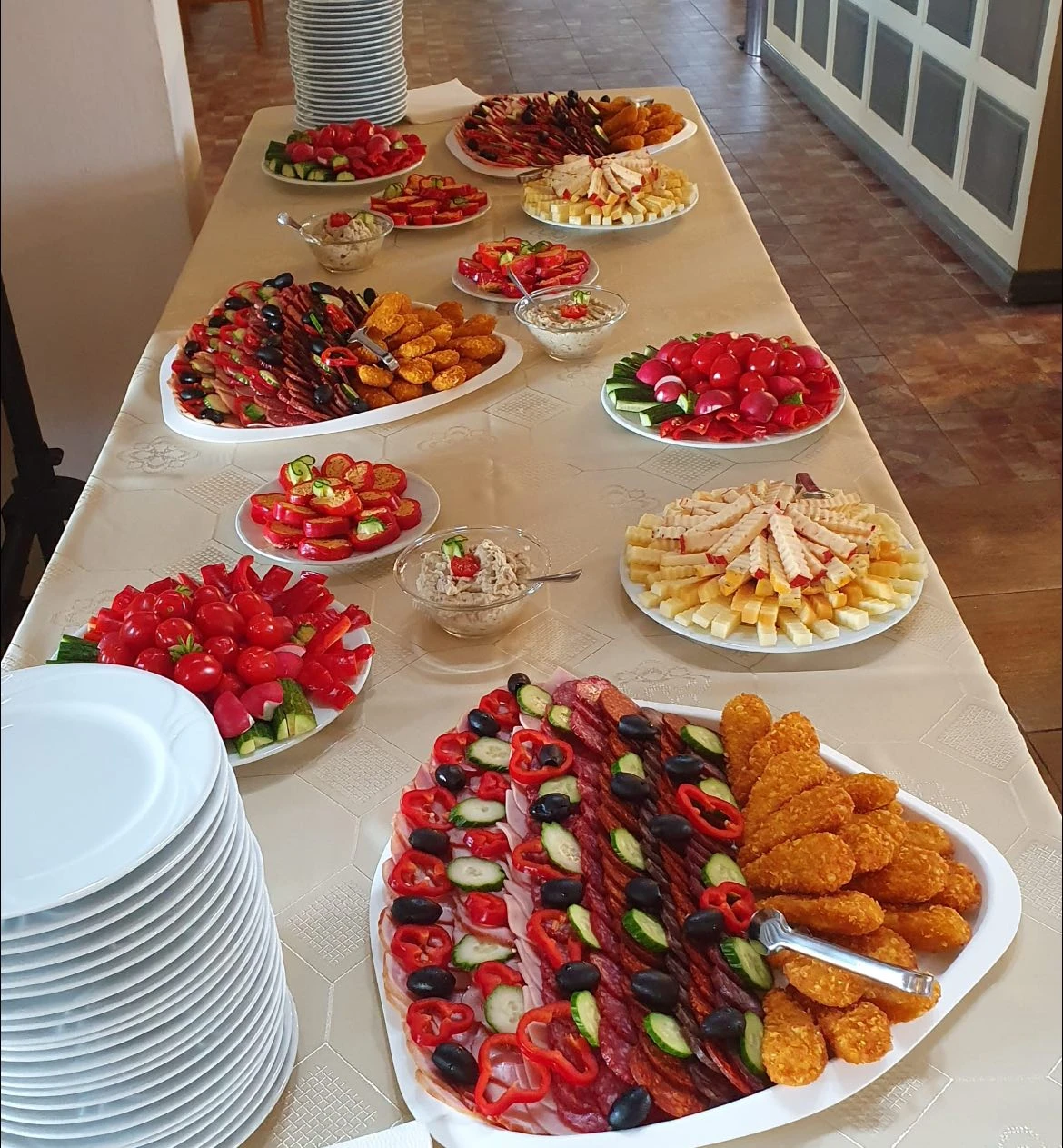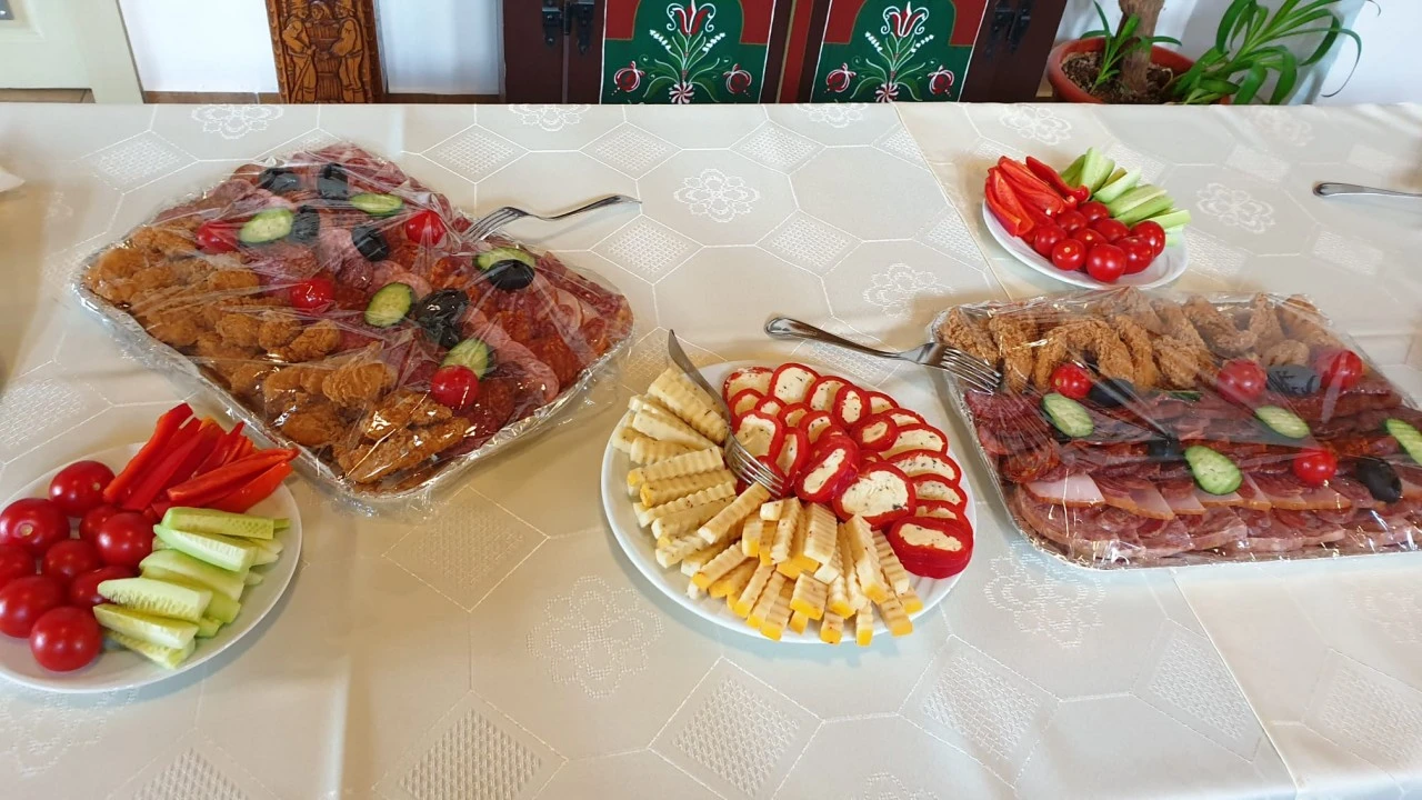 - A kínálatban ízletes hidegtálak, friss zöldségek, házi padlizsánkrém, csirkemell falatok, valamint sajt- és felvágottválogatás szerepel, házi kenyérrel kiegészítve, amelyek minden ünnepi asztal ékkövei.