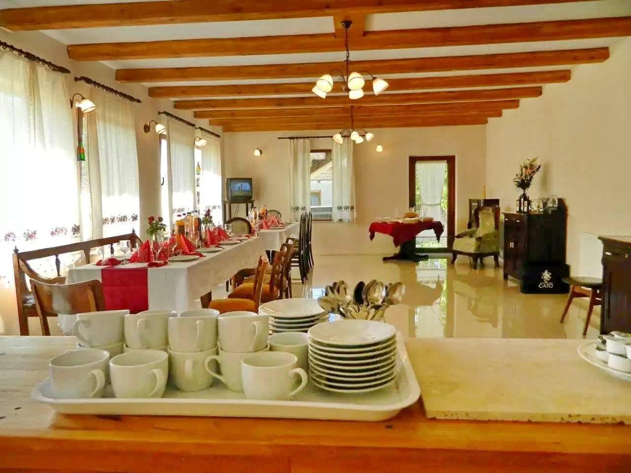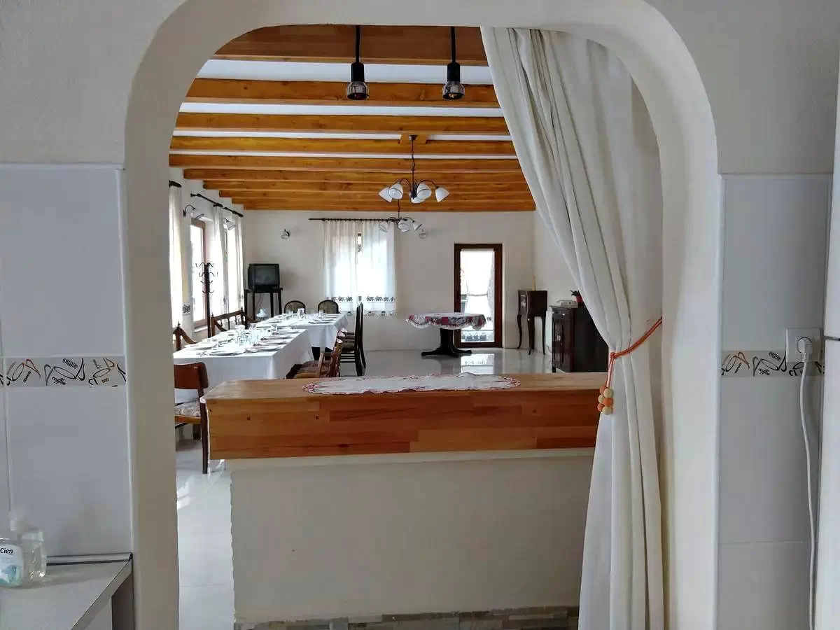 - fölszerelt konyha foldszinten 17 m2 / ebédlő 50 m2 - 30 személyre (hűtő, mikró ,pirító, edények, teríték stb.).