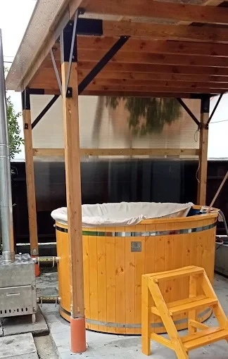 - Födött lugas – gerendából az udvarban 20 m2, 8 személyre asztal székek, grillező,