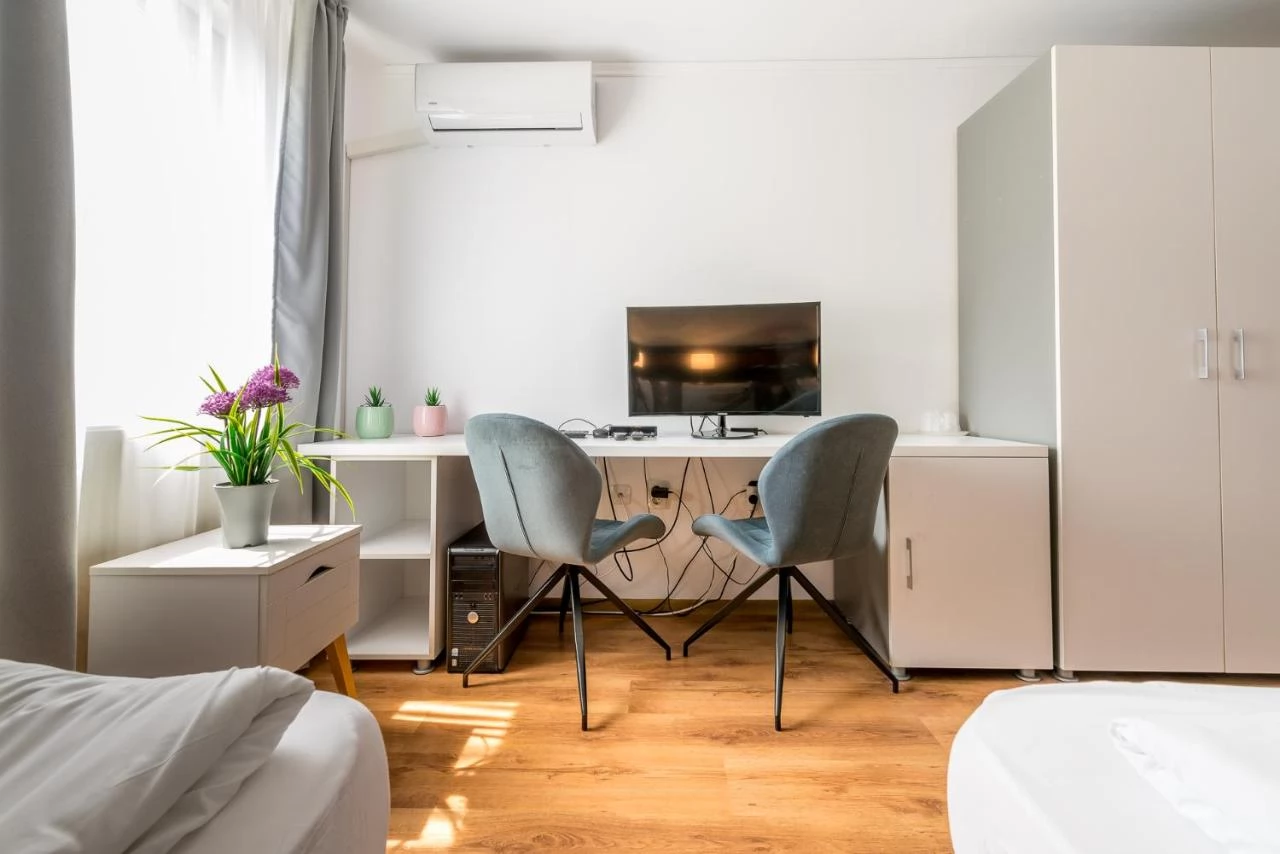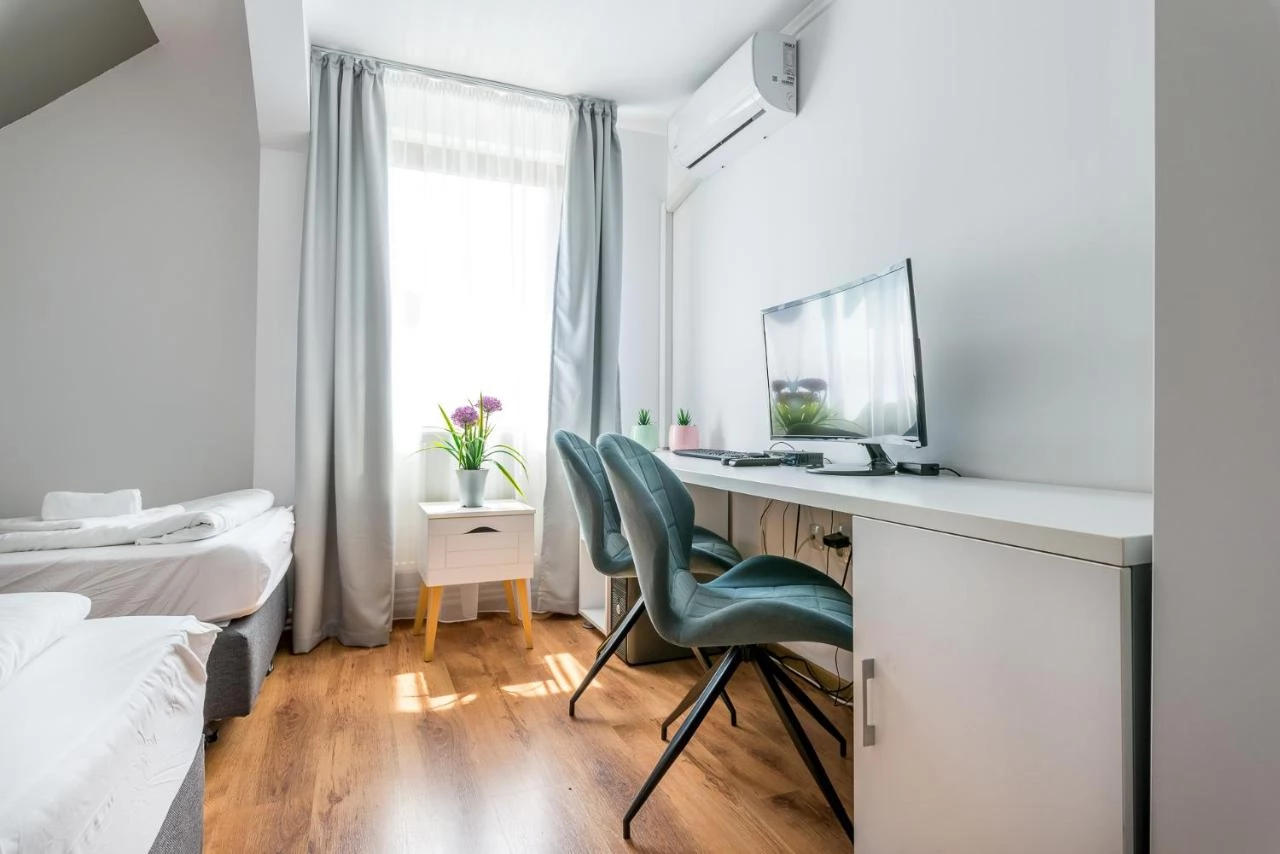 - A tágas, modern berendezésű, saját fürdőszobás 2,3,4 személyes saját fürdőszobás szobákban, kábel-tv-vel csatlakoztatott tv-vel és ingyenes vezeték nélküli internettel szolgál.