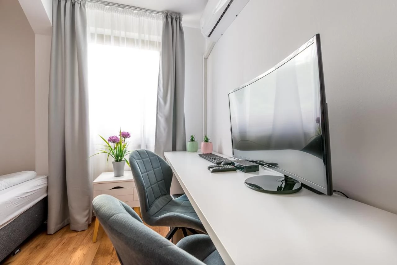 - A tágas, modern berendezésű, saját fürdőszobás 2,3,4 személyes saját fürdőszobás szobákban, kábel-tv-vel csatlakoztatott tv-vel és ingyenes vezeték nélküli internettel szolgál.