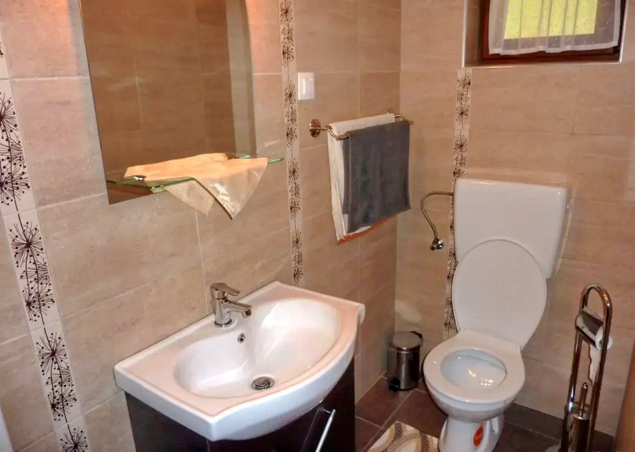 - Alsó szint: Nappali-ebédlő, teljesen felszerelt konyha, 3 kétágyas szoba, 2 fürdőszoba (zuhanyzó, WC, kézmosókagyló).