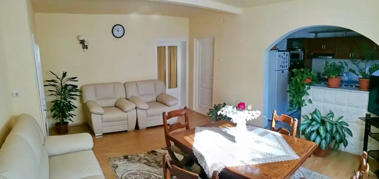 Felszerelt konyhával (gáztűzhely, hűtőszekrény, tea- és kávéfőző, stb.), valamint nagy nappali étkezővel rendelkezik.