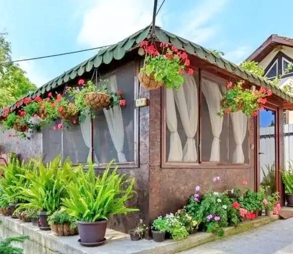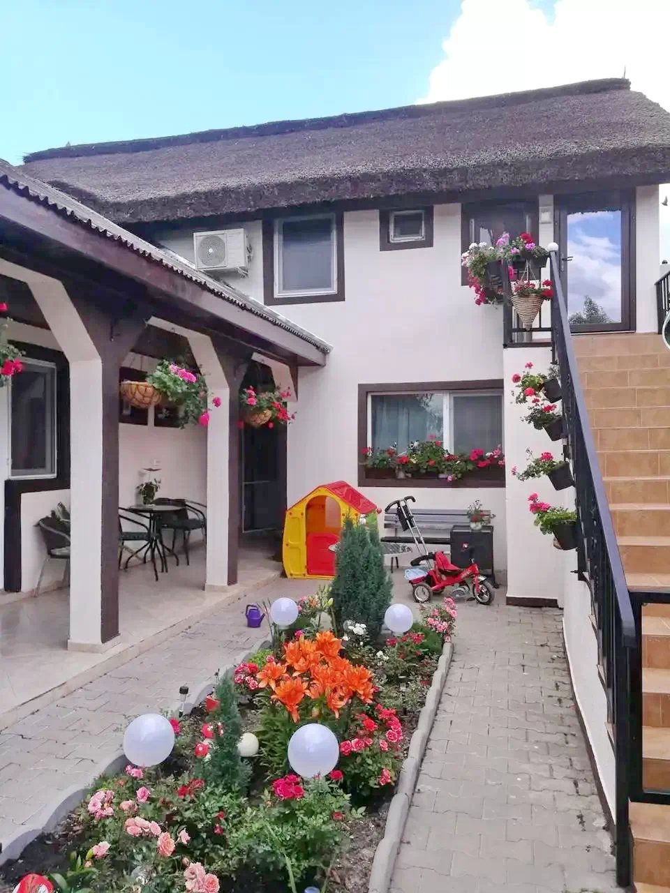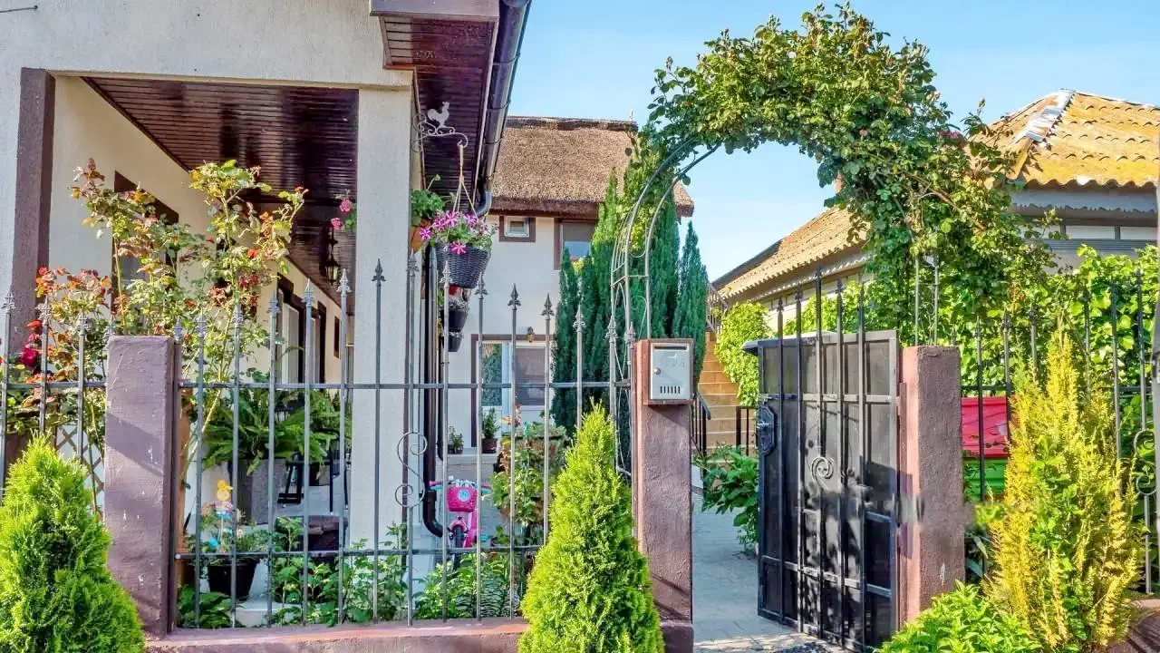 A panzió kis belső udvara rendezett, egy kis kávézó asztallal és 2 hintával felszerelve. A panzióval átellenben egy második kert és a stég található.