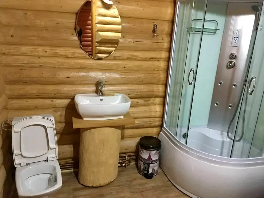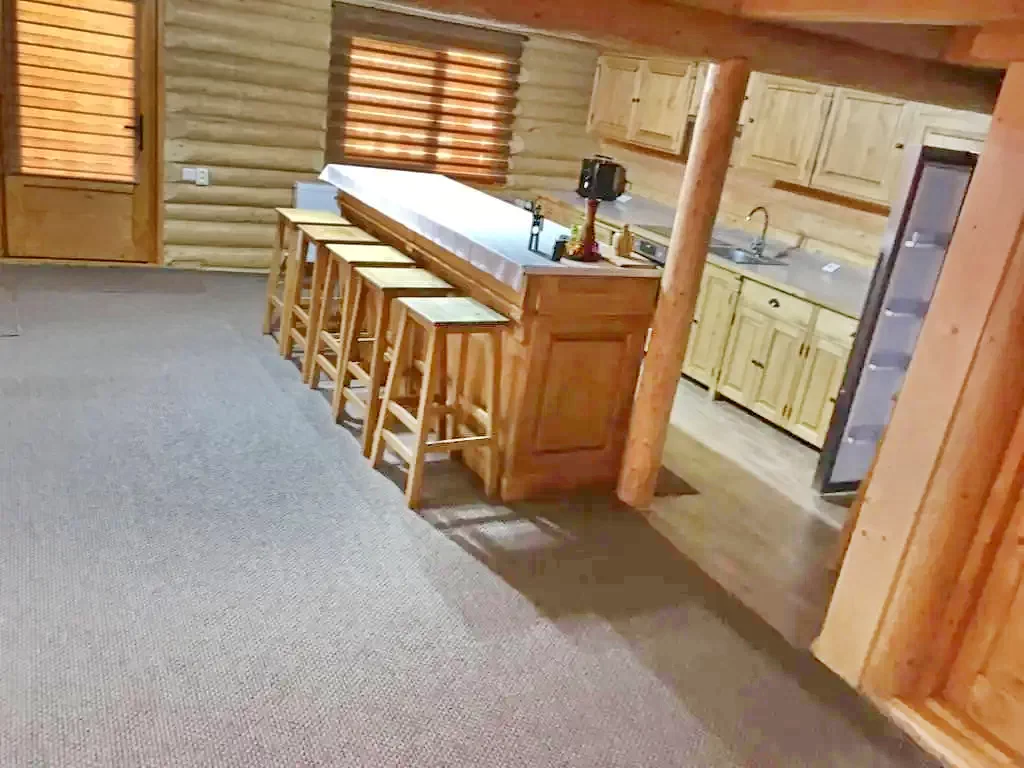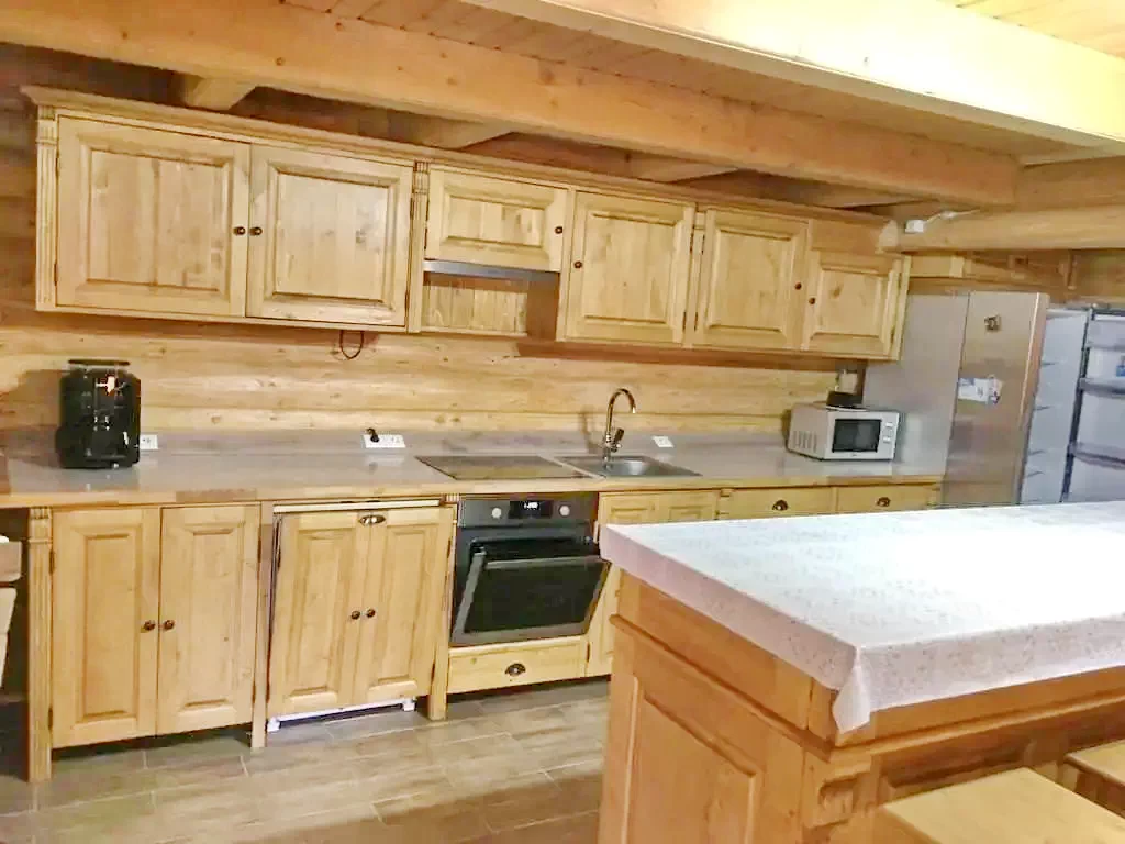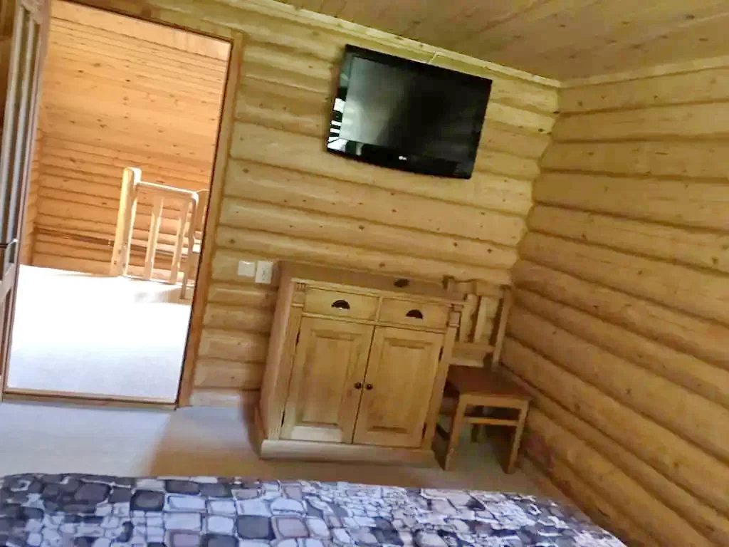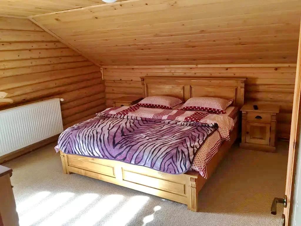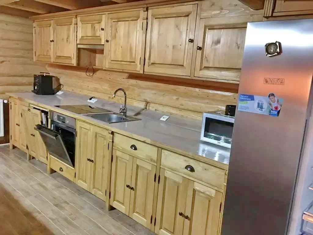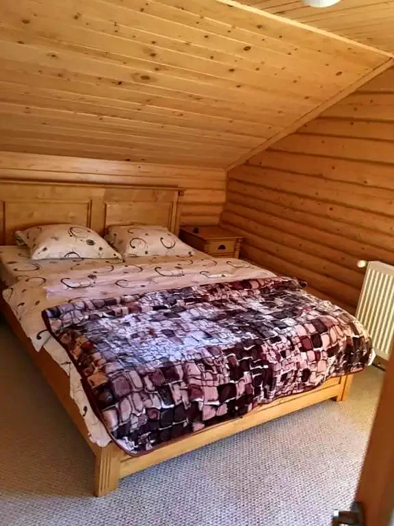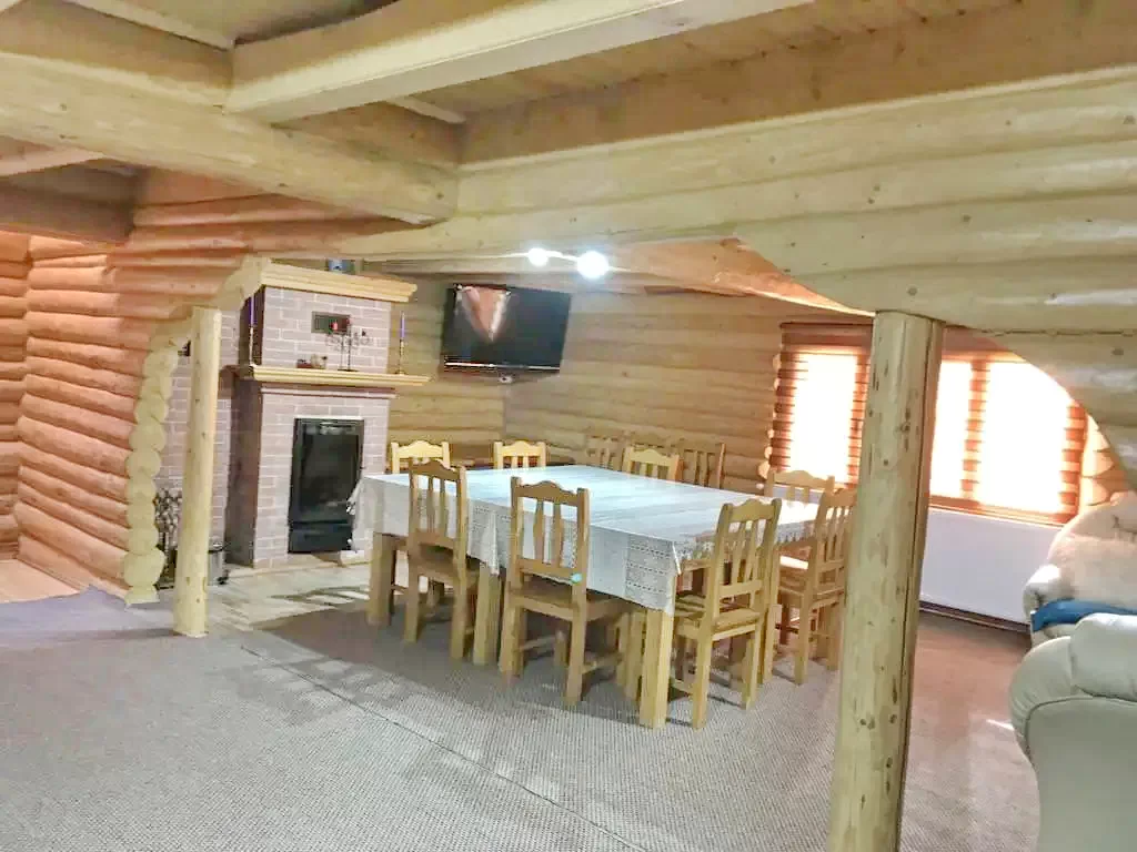 A tömör fagerendákból épült ház földszintjén található:a konyha, étkező, nappali (kanapé, LCD TV, kandalló) és a fürdőszoba.
