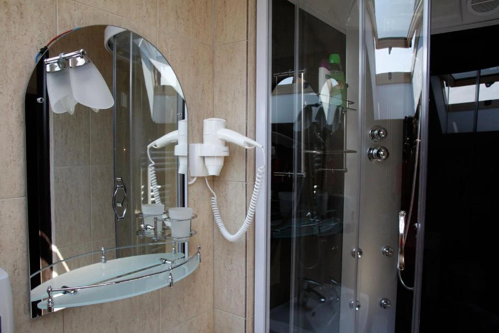 - Fürdőszoba: Zuhanykabin üvegfallal, hajszárító, puha törölközők, ingyenes piperecikkek (sampon, tusfürdő), vécépapír, modern csempe, LED-tükrös szekrény.