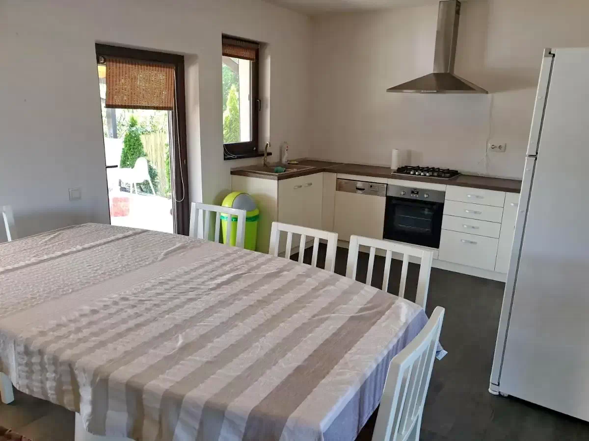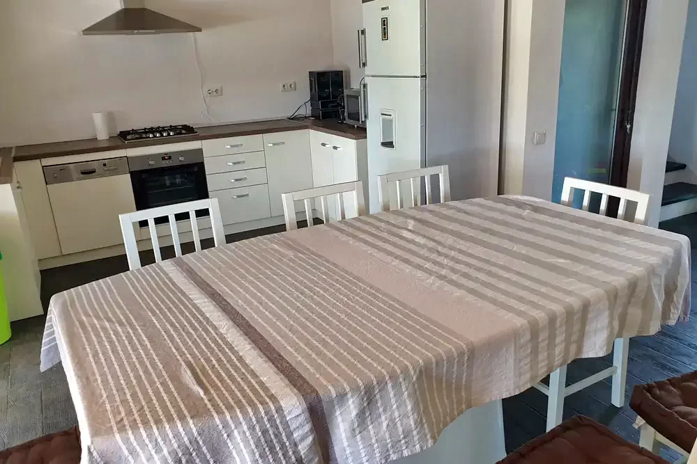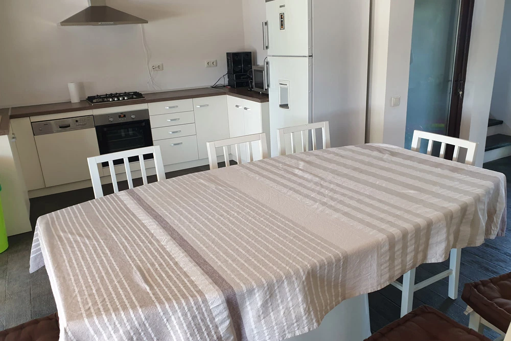 - A földszinten tágas nappali és teljesen felszerelt konyha várja a vendégeket, akár 14 személy számára kényelmes étkezési lehetőséggel.
