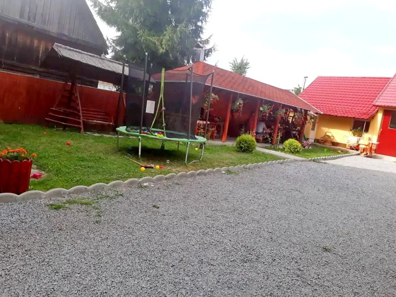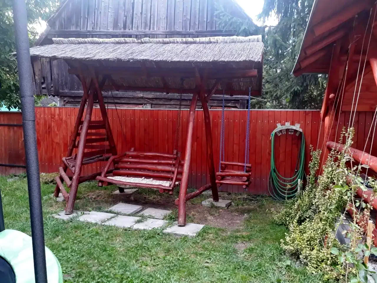 A tágas és parkosított udvarában födött kiülő, tüzrakóhely (grill, bogrács), játszótér, illetve zárt parkolóval szolgál.