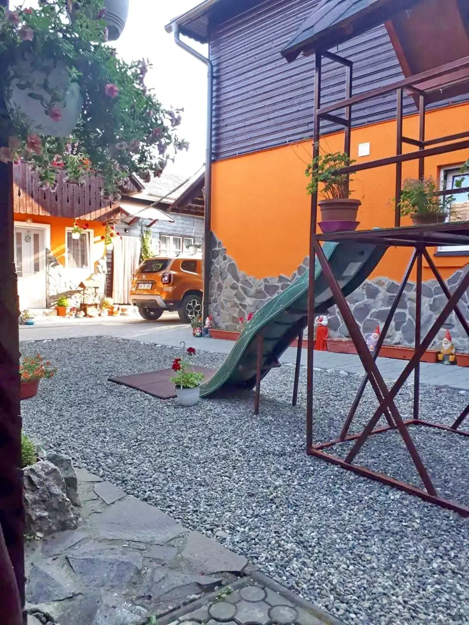 - Az udvaron található játszótér a gyerekek számára kellemes szórakozást kínál, míg a felnőttek kényelmesen pihenhetnek a lugas árnyékában.