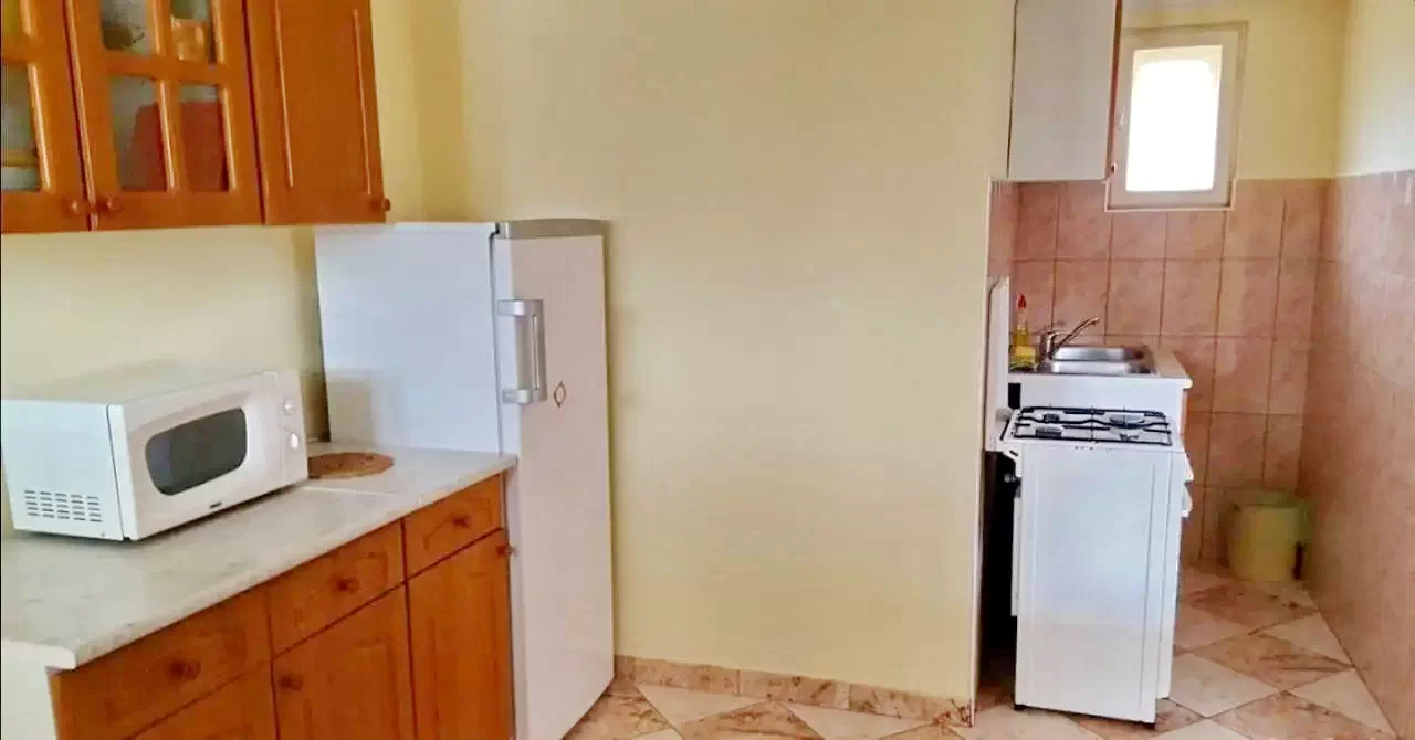 - Hűtőszekrény, tűzhely, edények – minden adott a főzéshez.