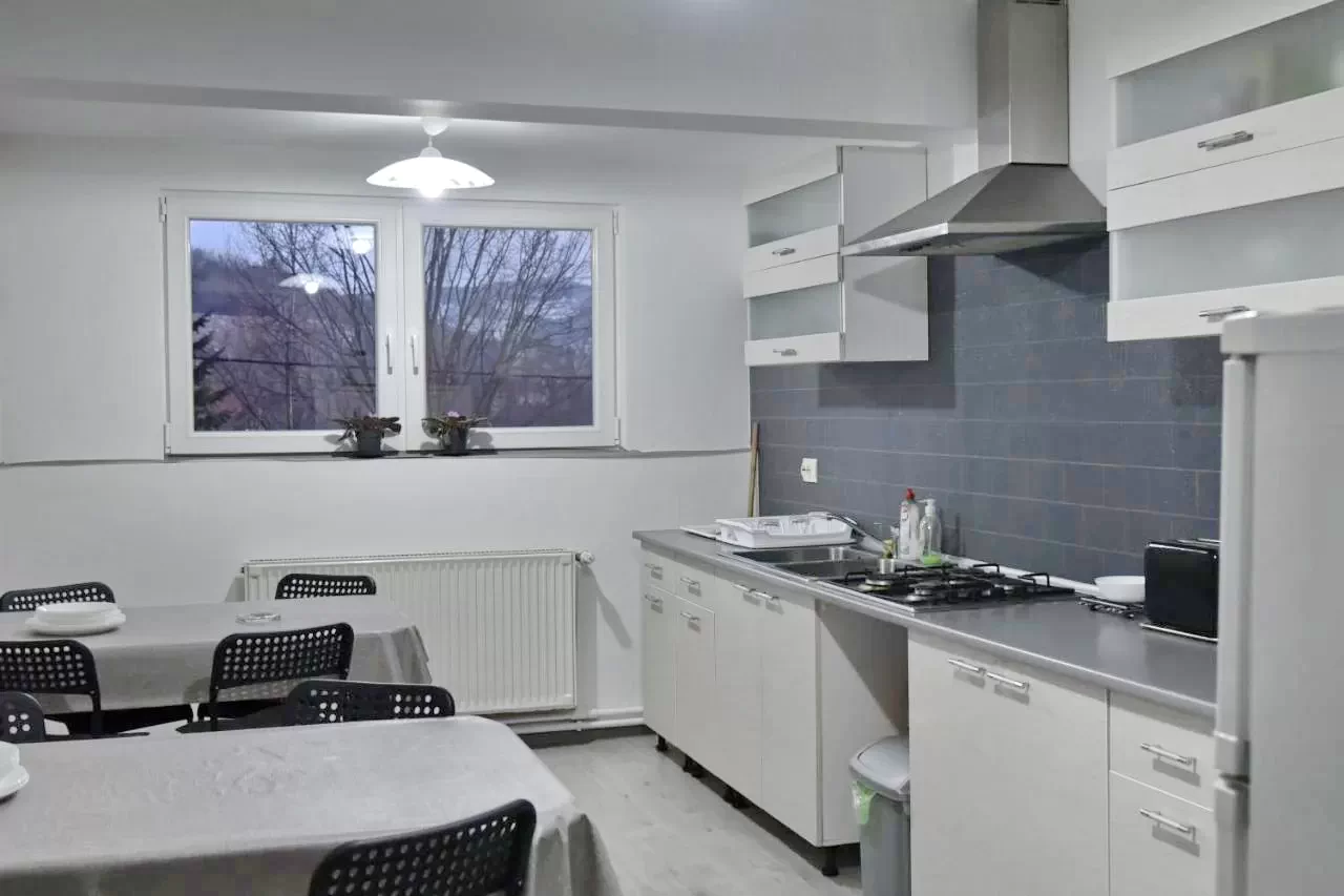 - Felszerelt konyha (gázkályha, munkaasztal, hűtőszekrény, evőeszközök, edények, stb.)