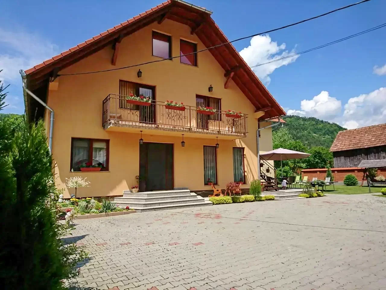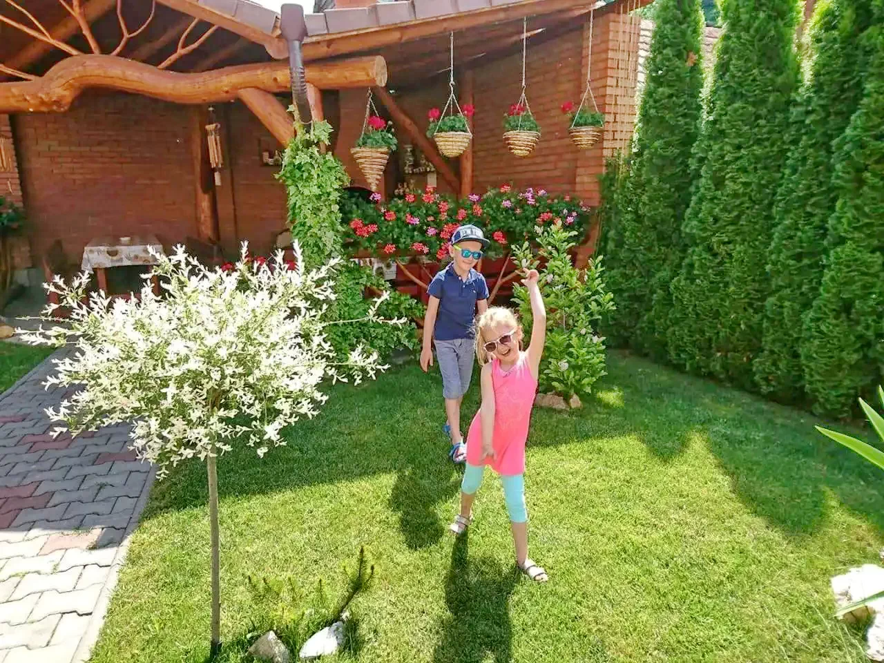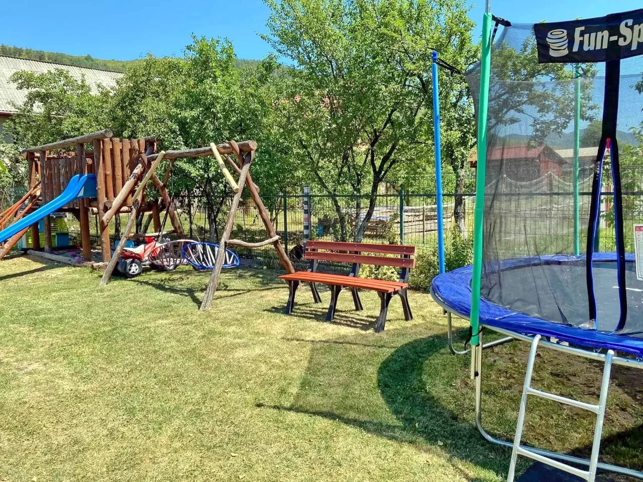 - Parkosított kerttel, benn pavilonnal, sütőkenecével, grill-bogrács lehetőséggel, játszótérrel, trambulinnal, hintával, csúszdával, valamint a vendégház udvarán parkolási lehetőséggel szolgál.