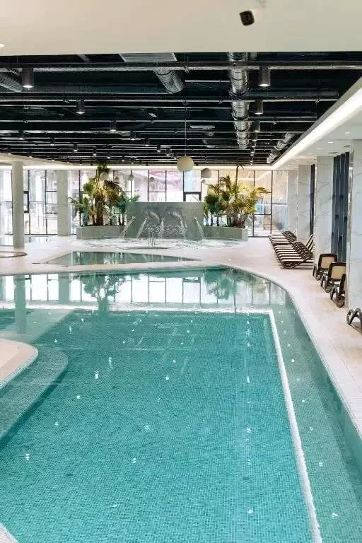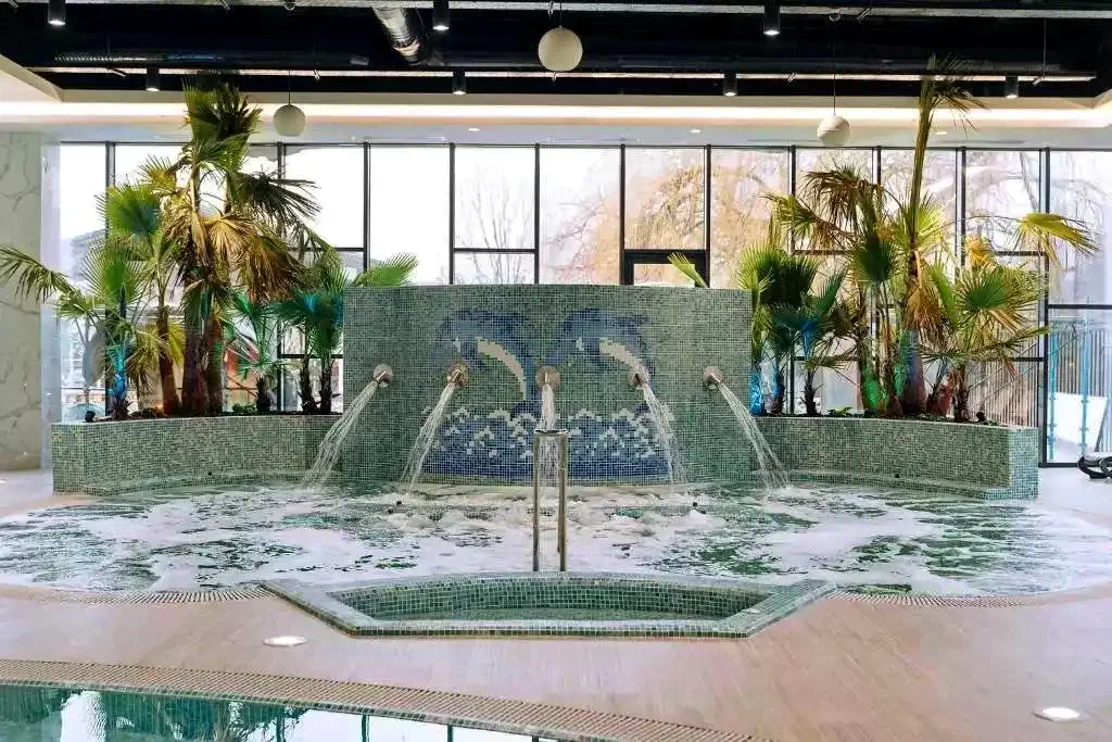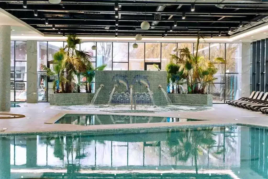 - A hotel wellness-részlege 200 férőhelyes medencével, 3 csúszdával, hullám-medencével, valamint egy színes csúszdával ellátott gyermekmedencével felszerelt.