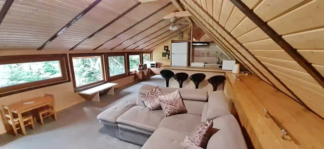 A nyaraló LED TV -vel ellátott nappalival, benne kábel TV - vel, biliárd aszatallal, a kandallóval, pihenősarokkal, illetve ebédlővel rendelkezik.