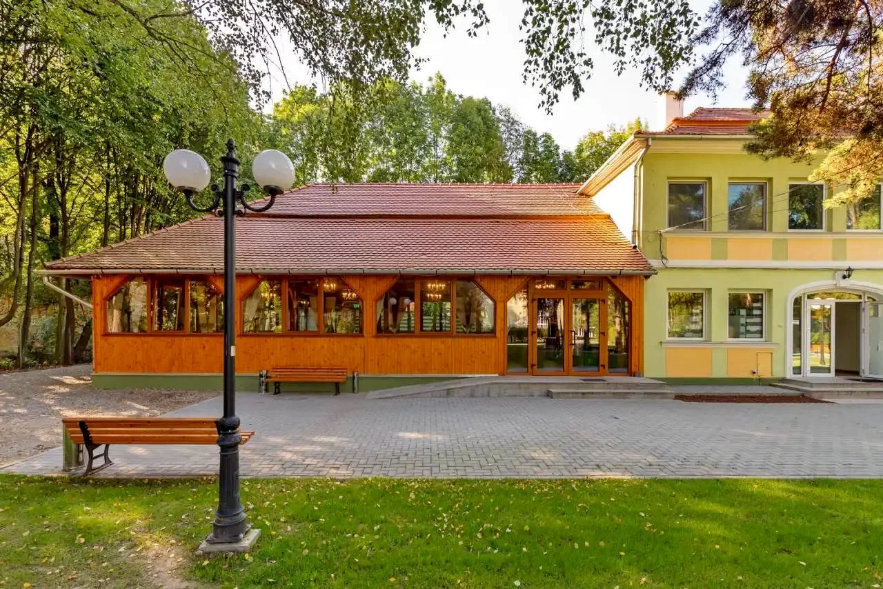A B épületben találhatók az étterem- és konferenciahelyiségek, valamint a nyári terasz.