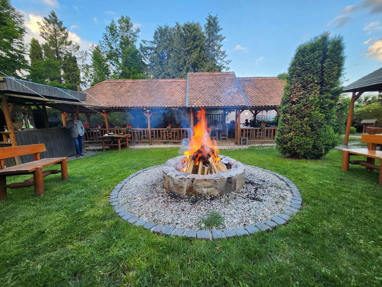 Tábortűz és élőzene a szálló udvarán