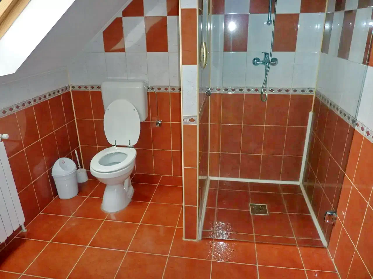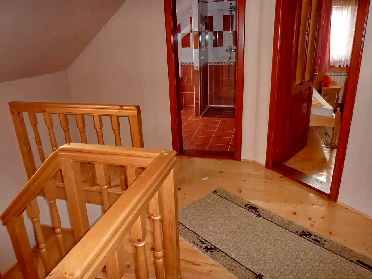- Az emeleten három szoba van: két szoba egy-egy kétszemélyes ággyal, a harmadik szoba egy kétszemélyes ággyal és egy egyszemélyes ággyal, valamint egy fürdőszoba (zuhanyzóval, WC-vel, kézmosóval).