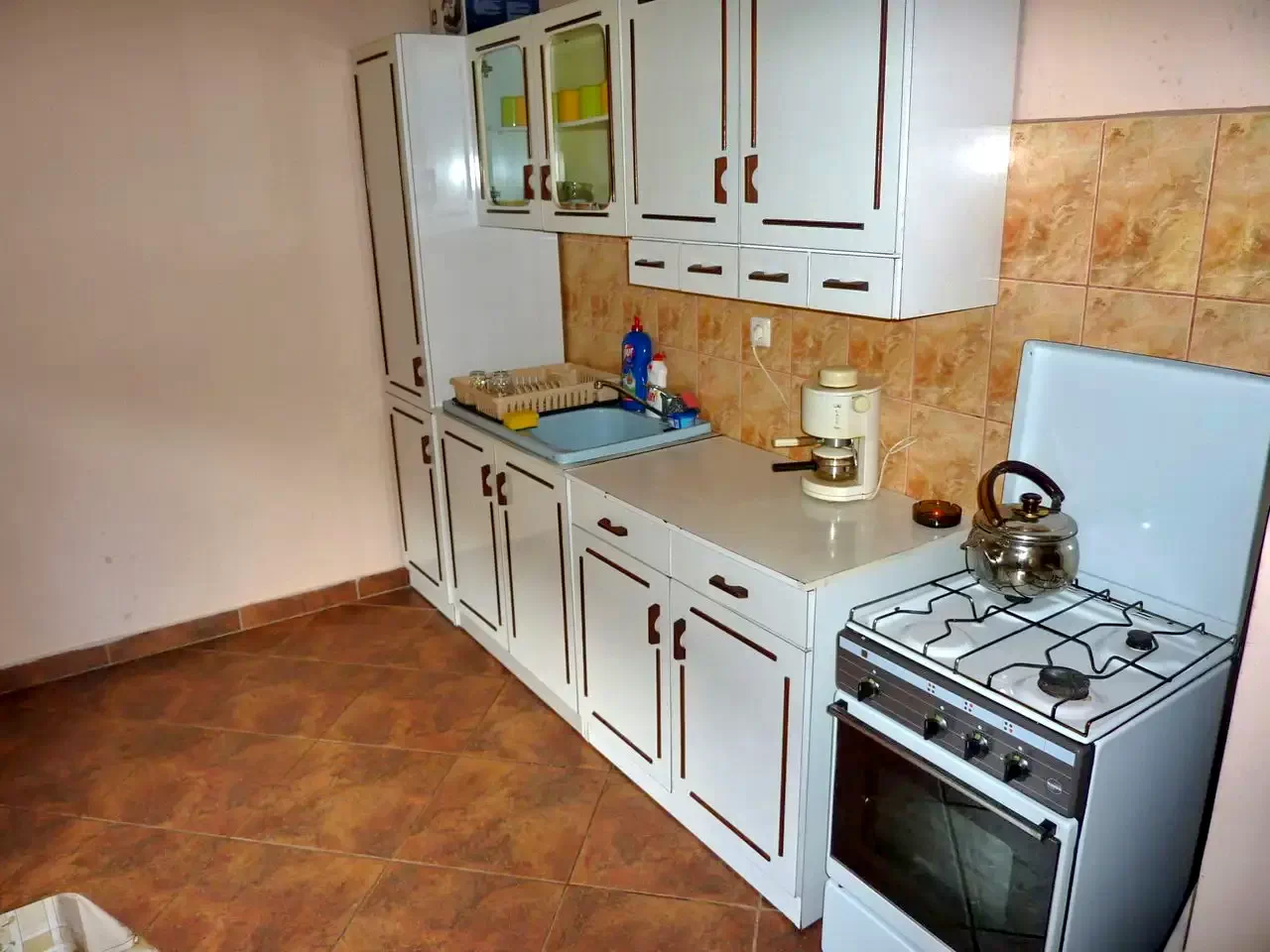 Konyha: Gáztűzhellyel, hűtőszekrénnyel.