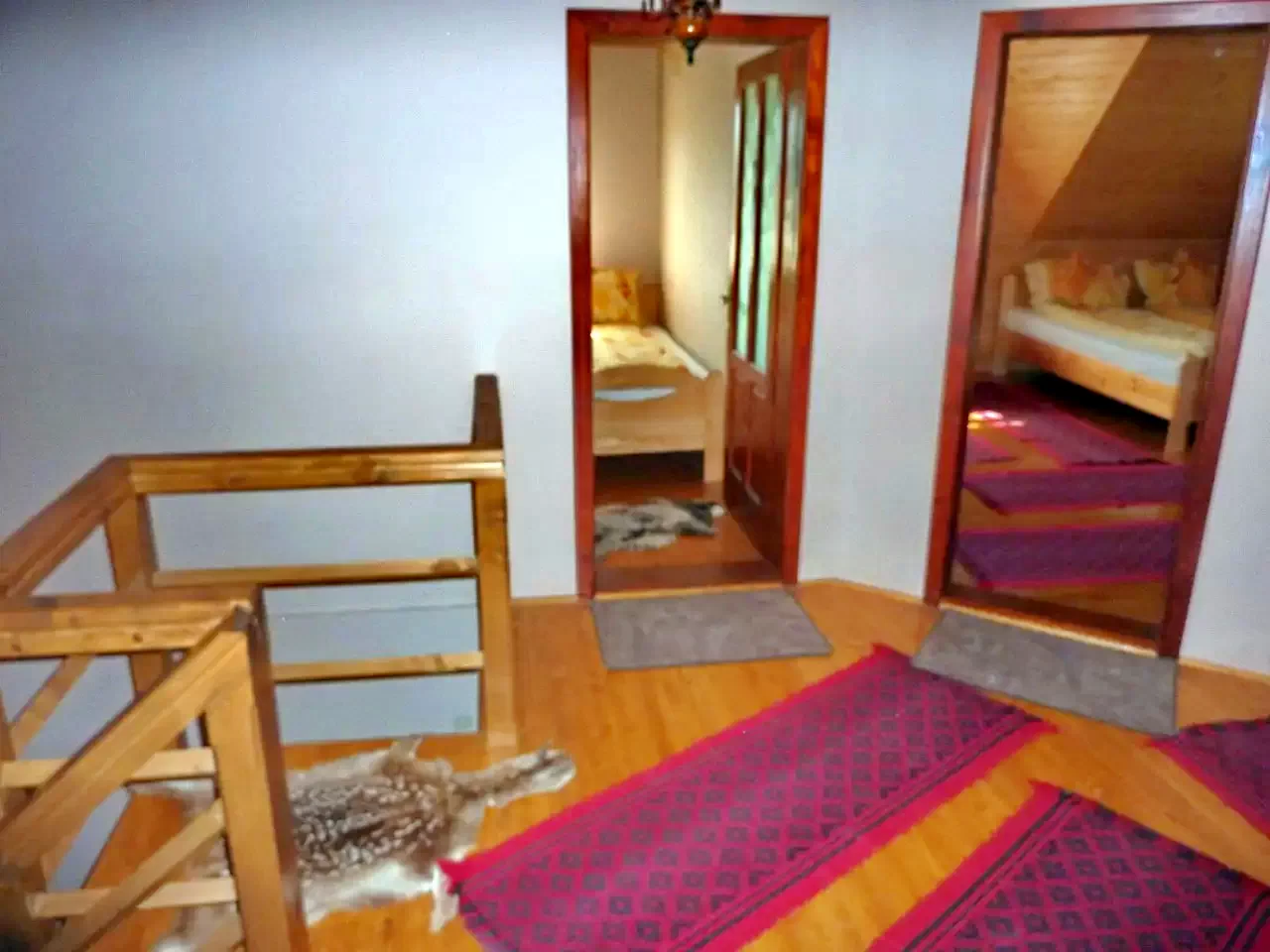 - Az emeleten négy szoba várja a vendégeket: az első szoba két egyszemélyes ággyal, a második szoba négy egyszemélyes ággyal, ezek egy közös fürdőszobát (zuhanykabinnal, WC-vel, kézmosóval) használnak; a harmadik szoba négy egyszemélyes ággyal és saját fürdőszobával (zuhanykabinnal, WC-vel, kézmosóval); a negyedik szoba két egyszemélyes ággyal, valamint egy további fürdőszoba (zuhanykabinnal, WC-vel, kézmosóval) a folyosón.
