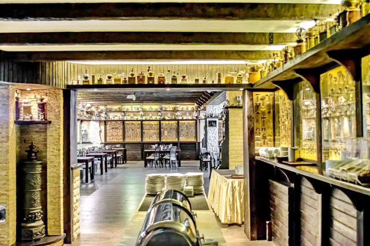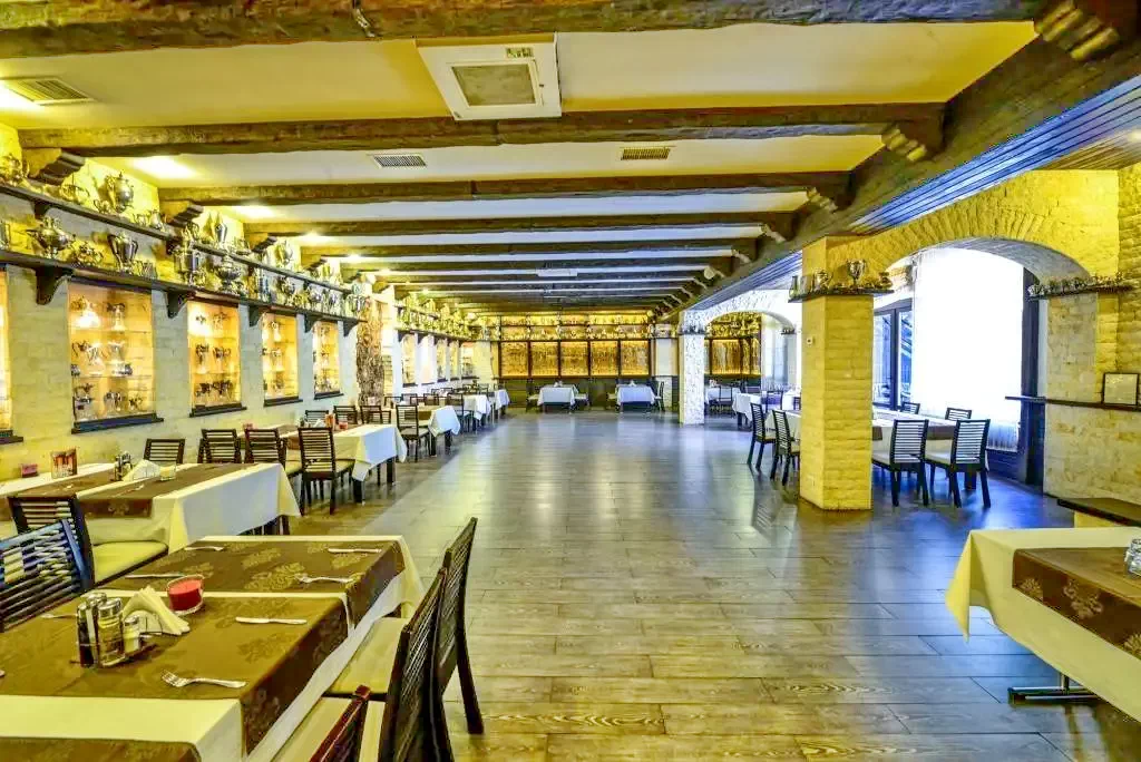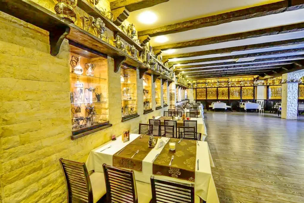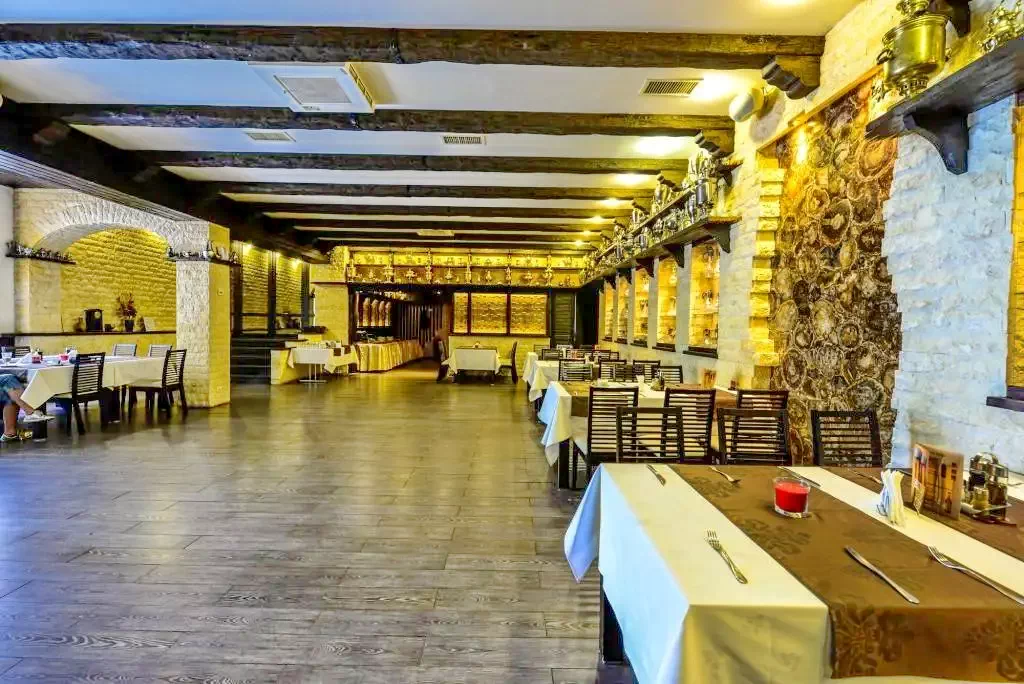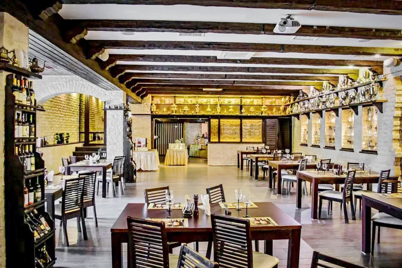 - A klasszikus, meghitt hangulatú, 100-120 férőhelyes étterem egyedi építészeti stílussal rendelkezik.
