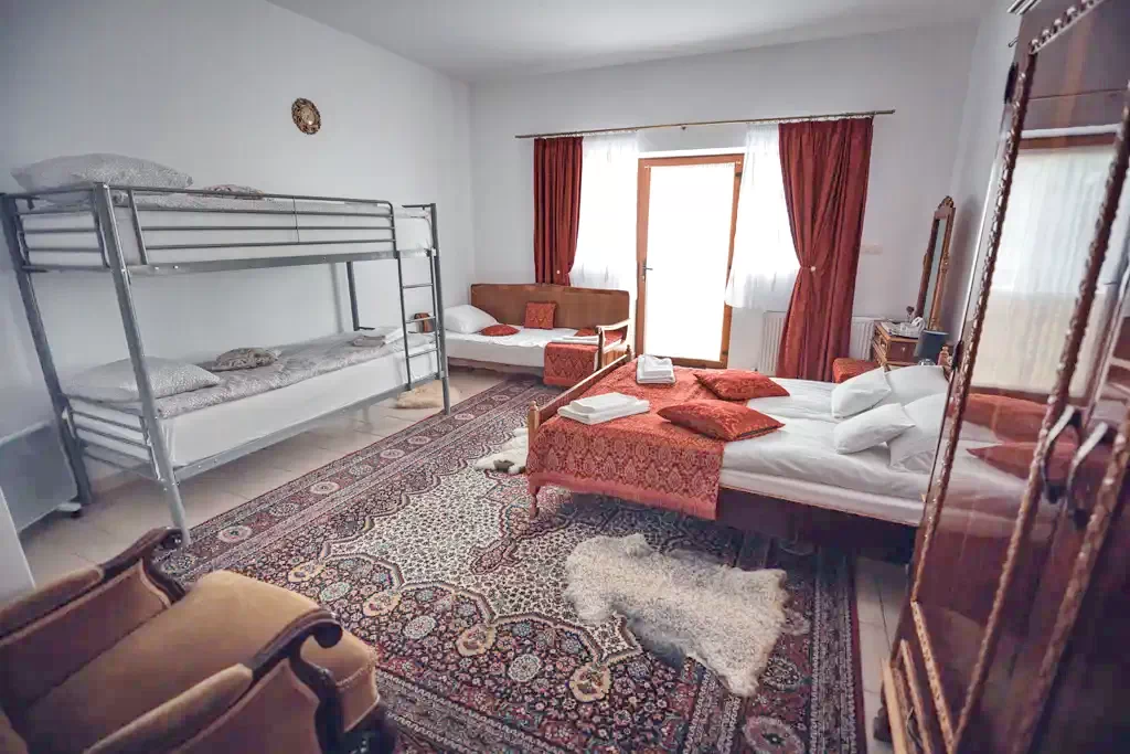 - 1 db 5 fős szoba (kétszemélyes franciaágy + egyszemélyes ágy + emeletes ágy)