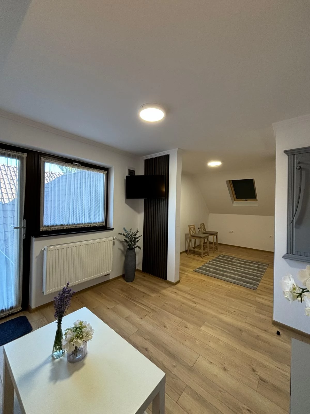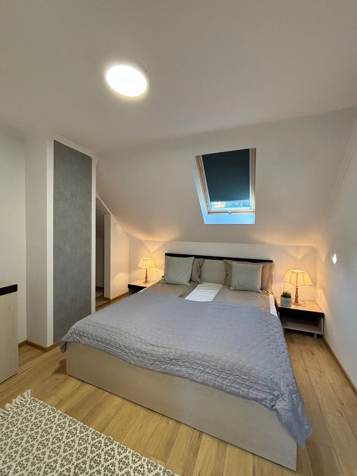 - 1 emeletes négyszemélyes apartman, a földszinten konyhával, az emeleten egy hálószoba, benne franciaágy, egy kihúzható kétszemélyes kanapé és fürdőszoba található.