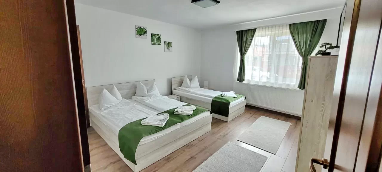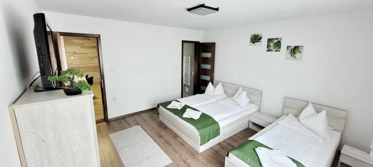 - 1 háromszemélyes szoba (benne franciaágy, egyszemélyes égy) saját belső fürdőszobával