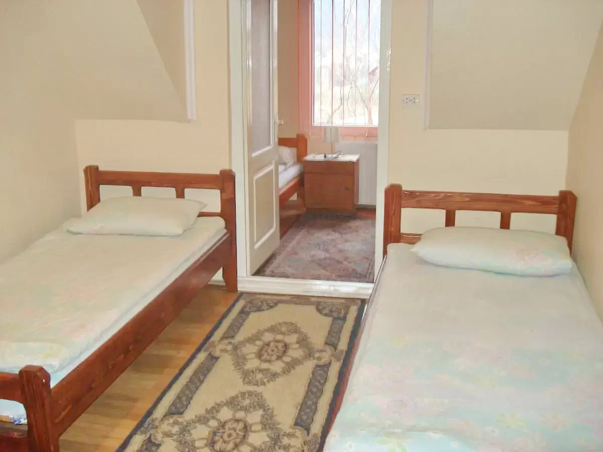 - Emelet: 2 db 3 fős szoba (egy-egy kétszemélyes és egyszemélyes ágy), saját fürdőszoba, TV