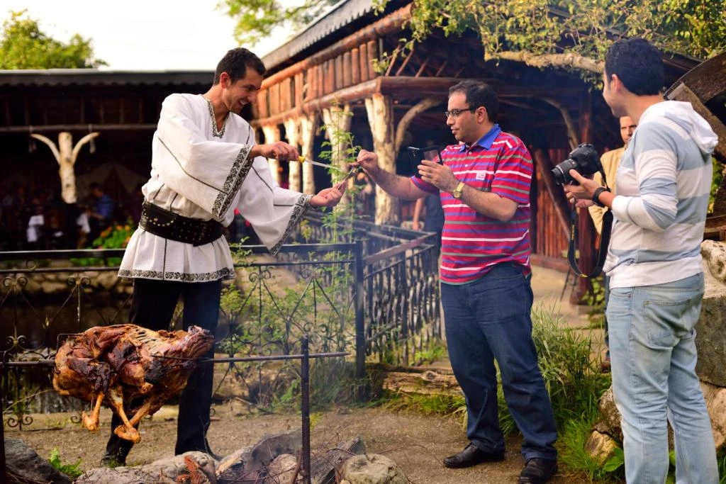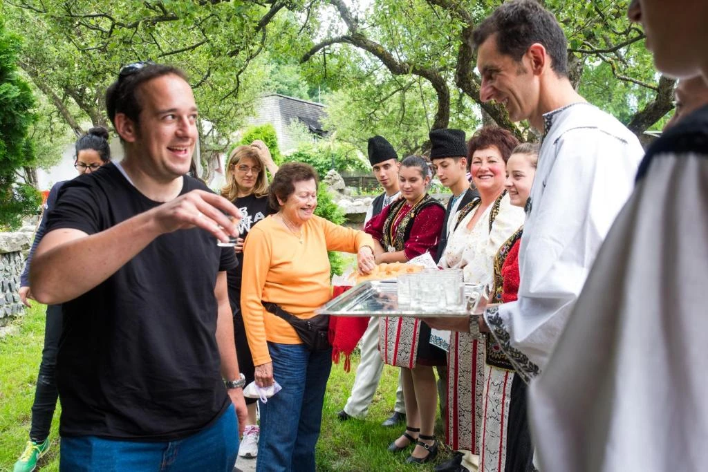 - Hagyományos fogadás (pálinka, sajt, kenyér, előétel sajtokból és sütött pisztrángból, népviseletes személyzet)
