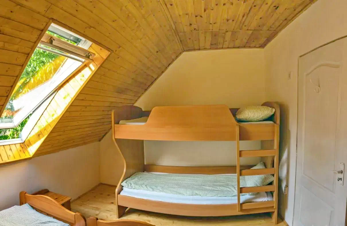 7-es szoba – 2 normál ágy + emeletes ágy → 4 fő, közös fürdő a 6-ossal