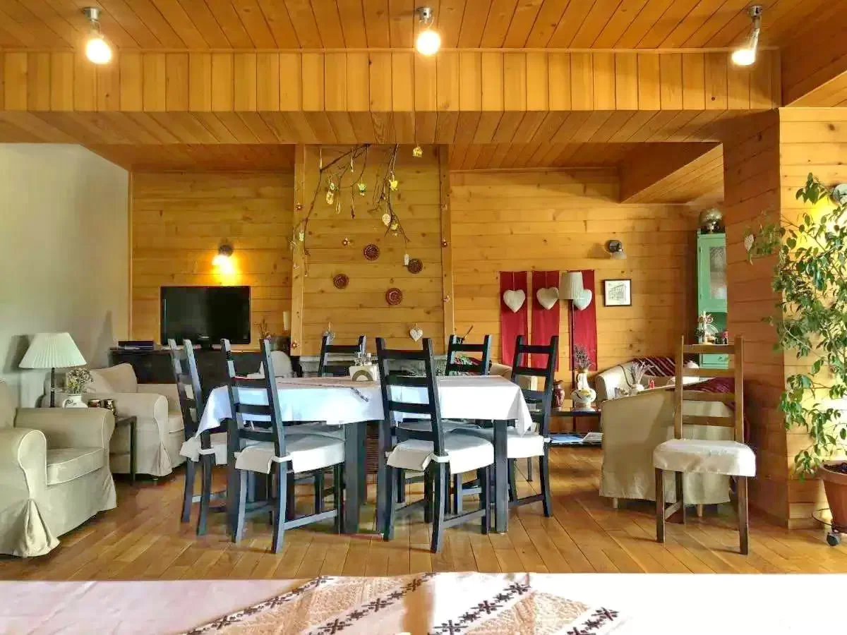 A vendégház társalgójában tölgyfa bútorok, kényelmes kanapék és fotelek, szőnyegek, valamint hangulatos kandalló található.
