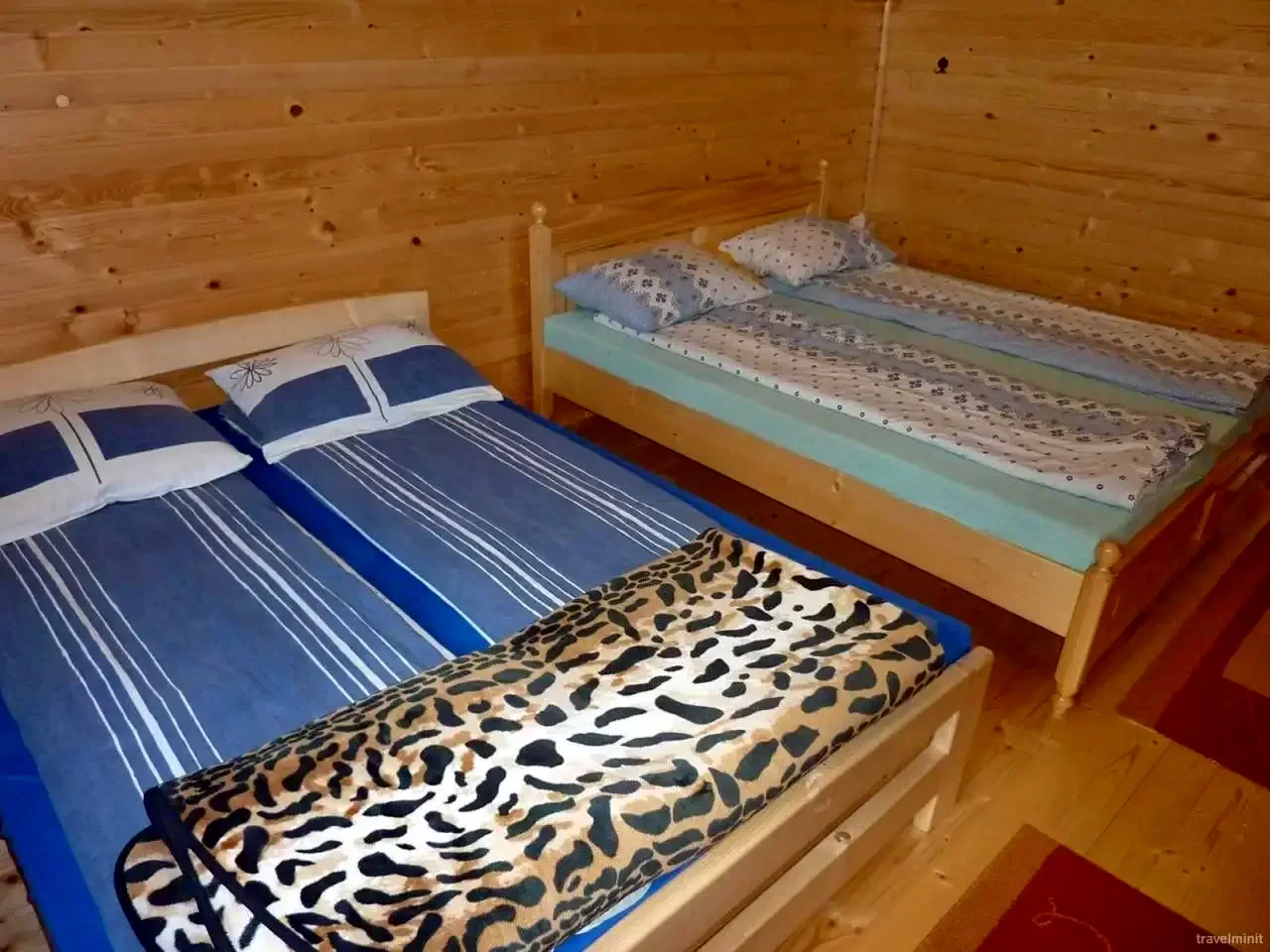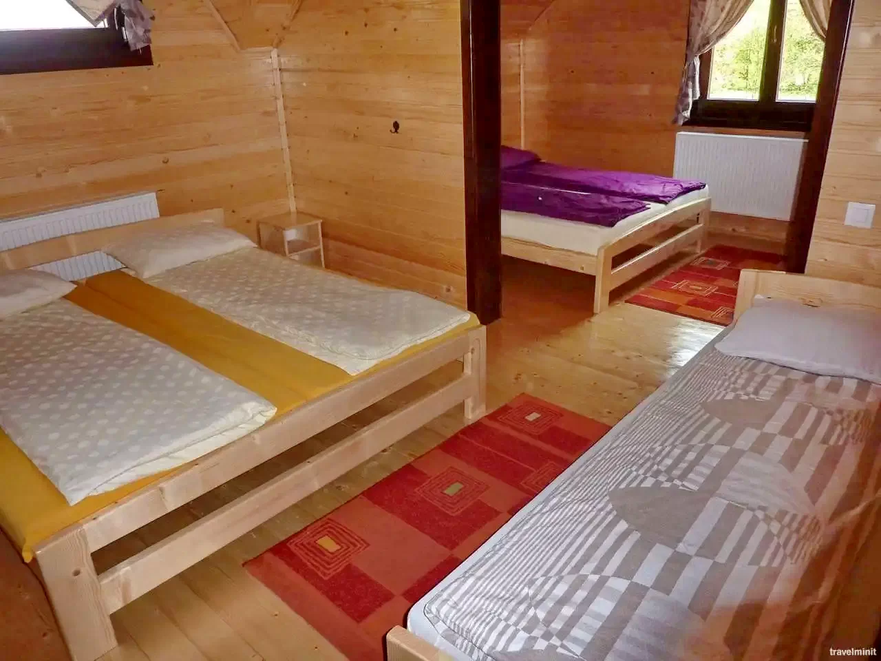 - Az emeleten három szoba és egy fürdőszoba (fürdőkáddal, WC-vel, kézmosóval) várja a vendégeket: az első szoba egy kétszemélyes ággyal és egy egyszemélyes ággyal (3 fő), a második szoba két kétszemélyes ággyal (4 fő), a harmadik szoba egy kétszemélyes ággyal és egy egyszemélyes ággyal (3 fő).