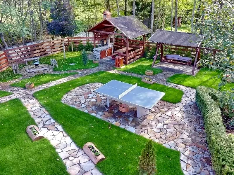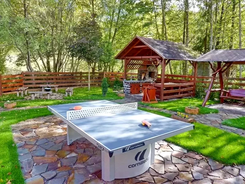 - Az udvaron számos szórakozási lehetőség várja a vendégeket: hinta, lipinka, csúszda, homokozó, pingpongasztal, lábtenisz- és röplabdapálya, valamint kosárlabda-palánk.