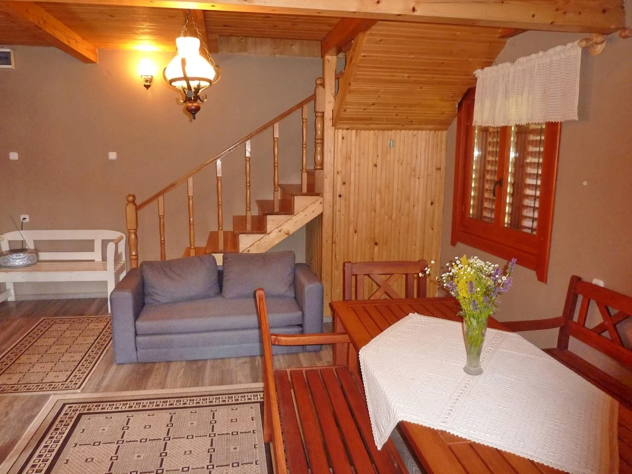 - A földszinten található egy nappali kihúzható fotelággyal, egy ebédlő, egy felszerelt konyha és egy fürdőszoba (zuhanyzóval, WC-vel, kézmosóval).