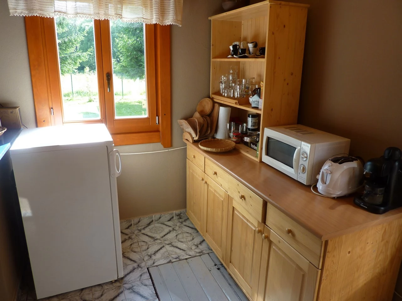 Konyhai eszközök: Gáztűzhely, hűtőszekrény, mikrohullámú sütő, kenyérpirító, kávéfőző, teafőző, edények, evőeszközök.